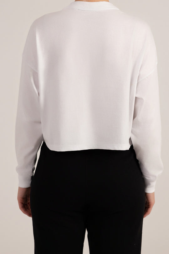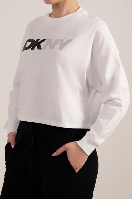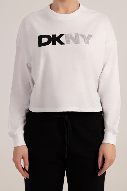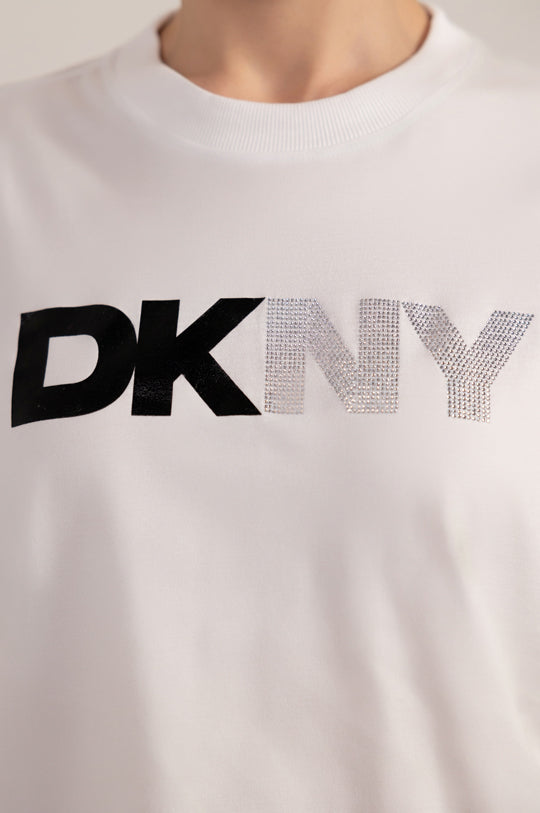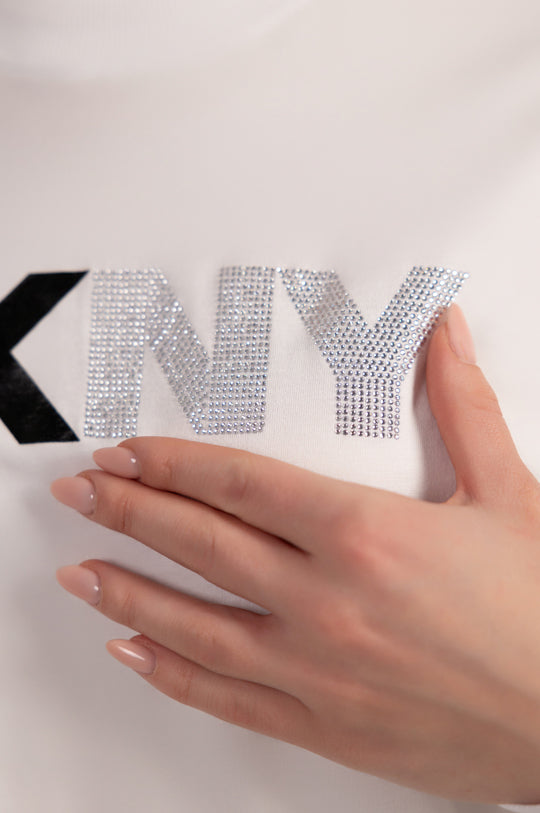 حسّني خزانة ملابسكِ مع تيشيرت DKNY بأكمام طويلة مزين بشعار لامع مرصع بأحجار الراين باللون الأبيض الناصع. هذه القطعة الأنيقة متعددة الاستخدامات تتميز بشعار لامع مرصع بأحجار الراين، مما يجعلها مثالية لإضفاء لمسة من الأناقة على أي إطلالة. مثالية لجميع المناسبات.