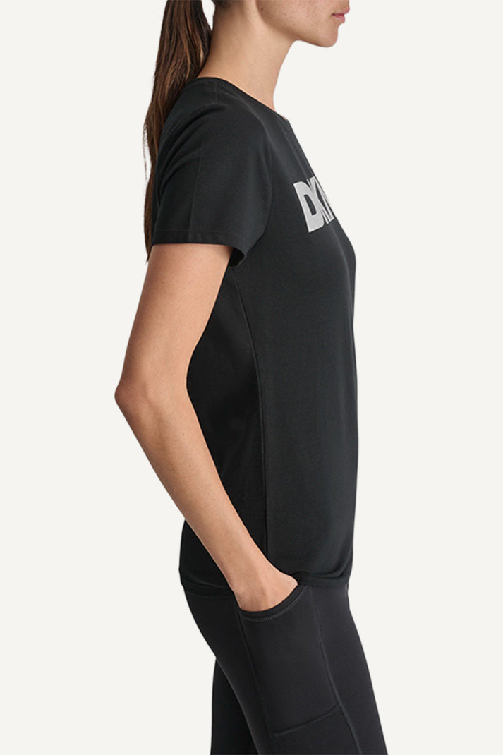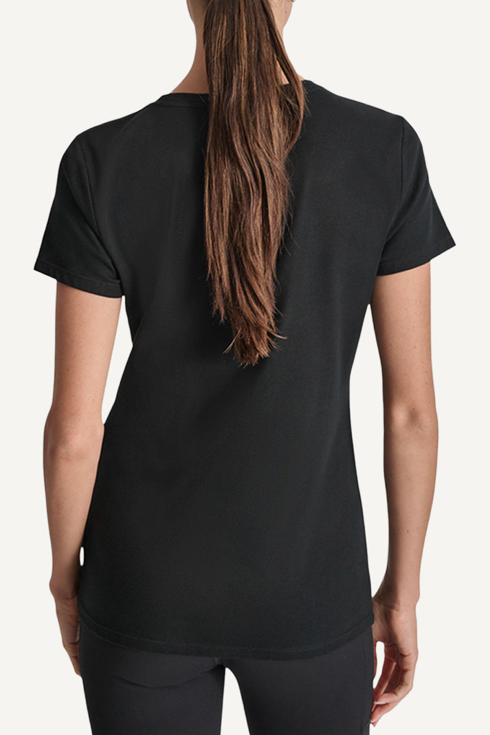 استمتعي بالبساطة والأناقة مع تي شيرت دكني بفتحة ياقة مستديرة ومزين بشعار باللون الأسود. يتميز هذا التي شيرت الرائع بفتحة ياقة مستديرة كلاسيكية، وتفاصيل شعار دكني الجريئة، ليمنحكِ أناقة عملية لا مثيل لها. يمكنك تنسيق هذا التي شيرت الرائع مع جينز أو تنانير ليمنحك إطلالة يومية أنيقة وعصرية.