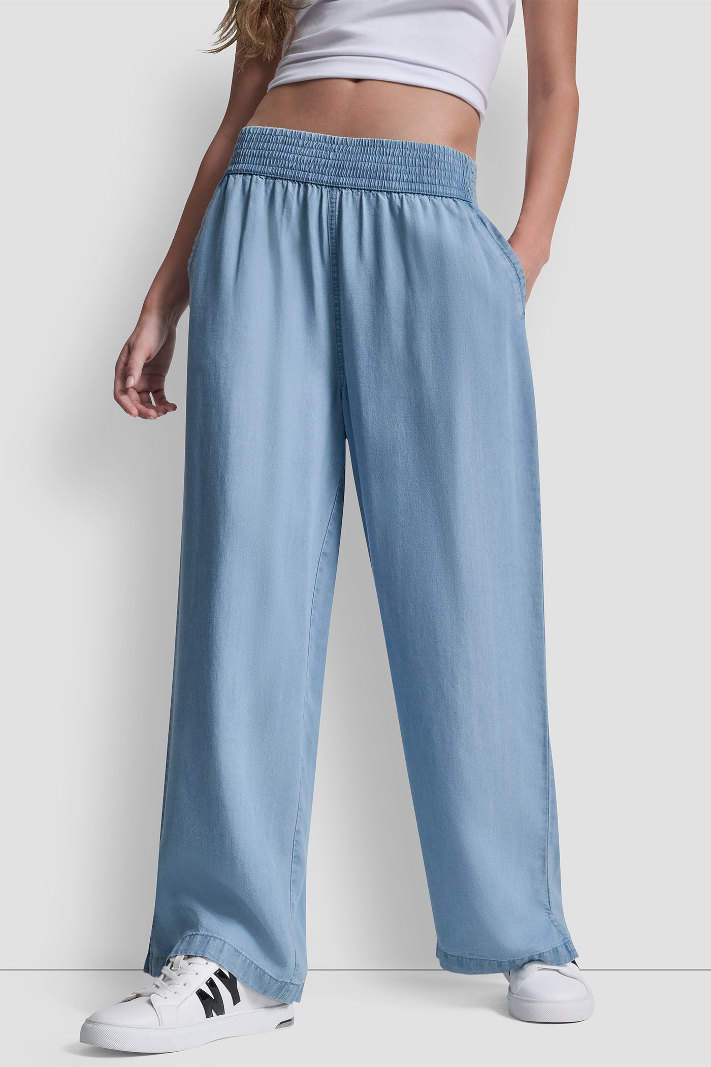 انعمي بإطلالة أنيقة غير متكلفة مع بنطال DKNY بتصميمه بقصة ساق عريضة بطول الكاحل باللون الأزرق. صُنع البنطال بالكامل من نسيج تينسيل فائق النعومة وجيد التهوية بنسبة 100%. وبفضل قصته العصرية التي تبرز جمال القوام، يُعد هذا البنطال الخيار المثالي لإطلالة يومية راقية أو للنزهات الهادئة التي تتطلب مظهرًا أنيقًا ومنمقًا في آنٍ واحد. رمز المنتج: DJ4P3006FJZ