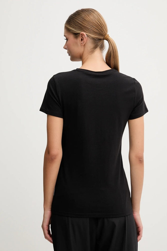 يعتبر تي شيرت دكني بأكمام قصيرة وفتحة ياقة مستديرة باللون الأسود الكلاسيكي قطعة أساسية لا غنى عنها في خزانة ملابسك. تم صنع هذا التي شيرت من قماش ناعم جيد التهوية، حيث يتميز هذا التي شيرت بقصّة عادية مريحة، مما يجعله مثالياً للارتداء فوق ملابس أخرى أو بشكل مستقل لتمنحك إطلالة يومية أنيقة.
