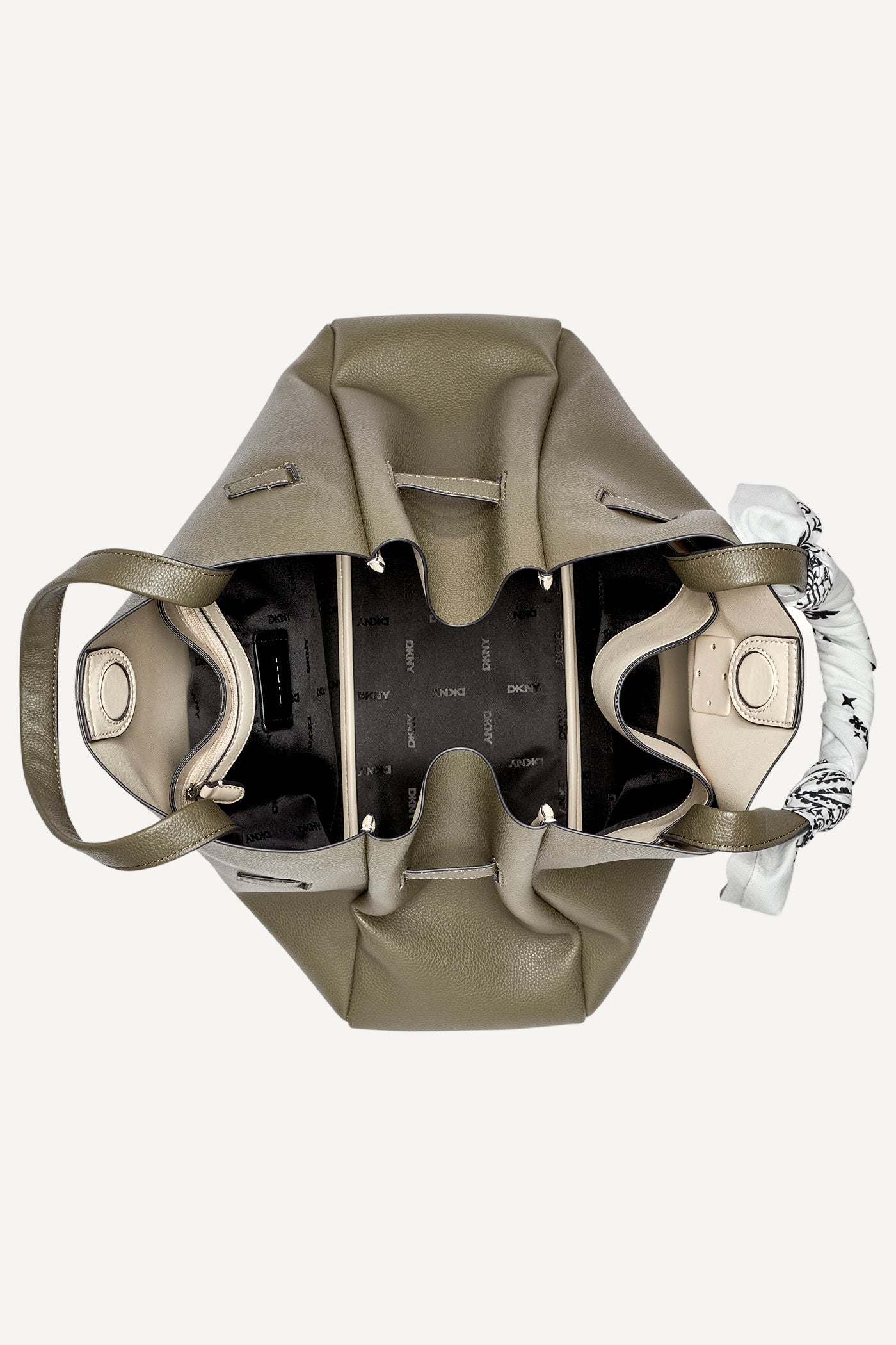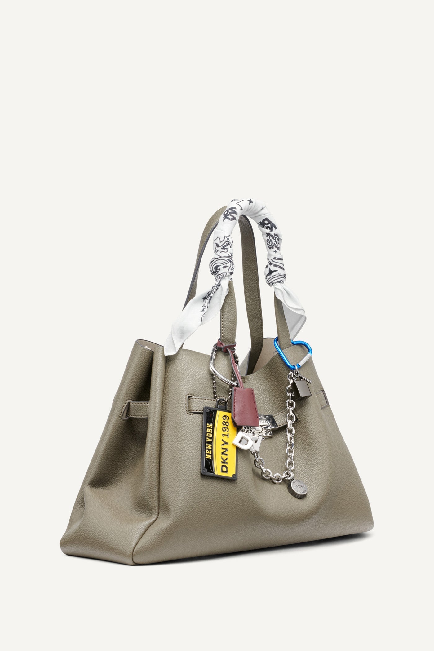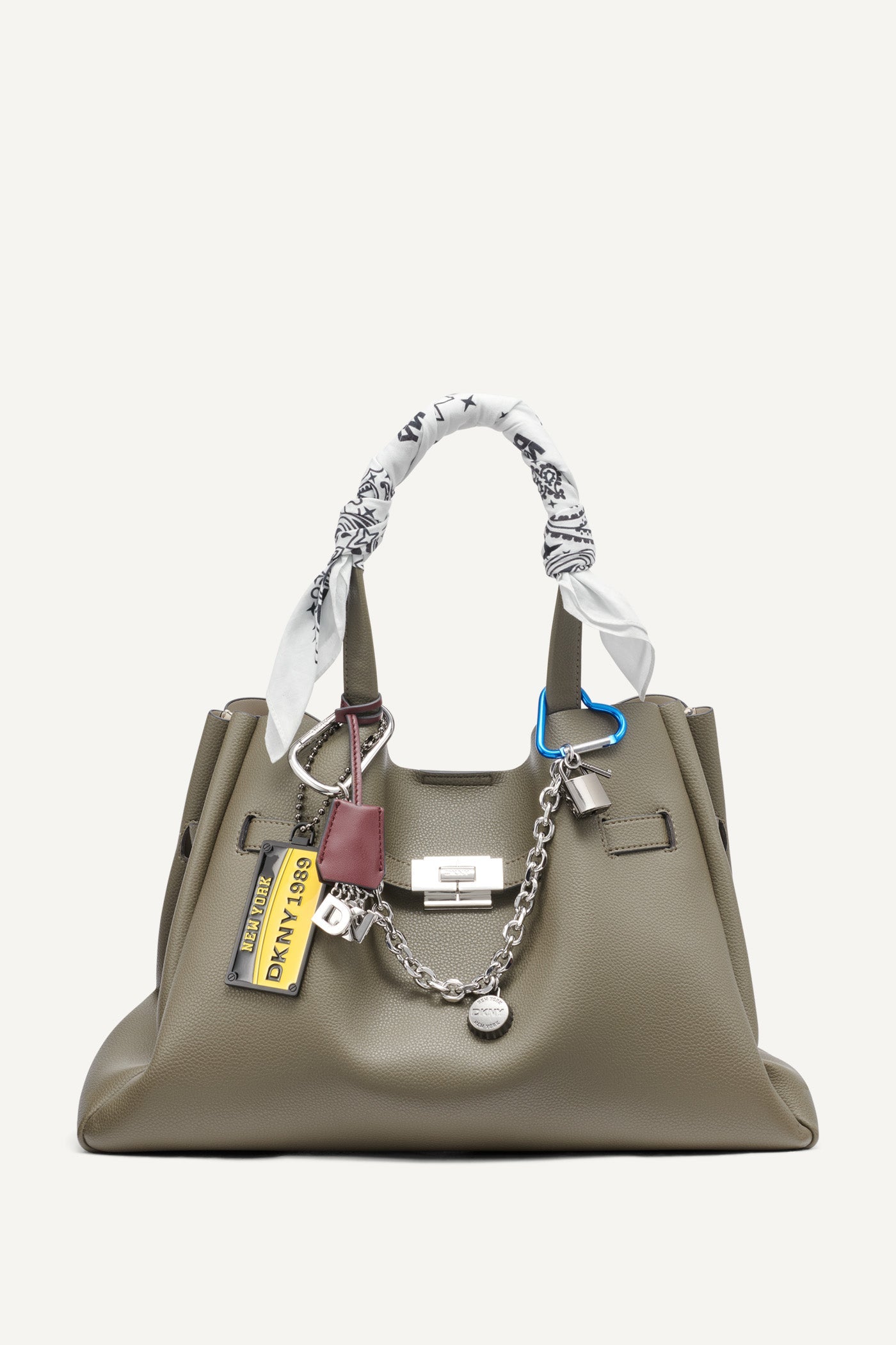 Add a pop of color to your look with the DKNY Bryar Large Satchel in vibrant green. This structured top handle bag features spacious compartments, luxe gold-tone hardware, and versatile carrying options-perfect for chic, everyday sophistication and organization.