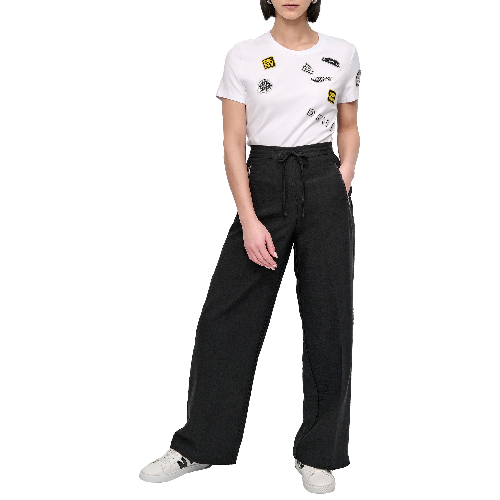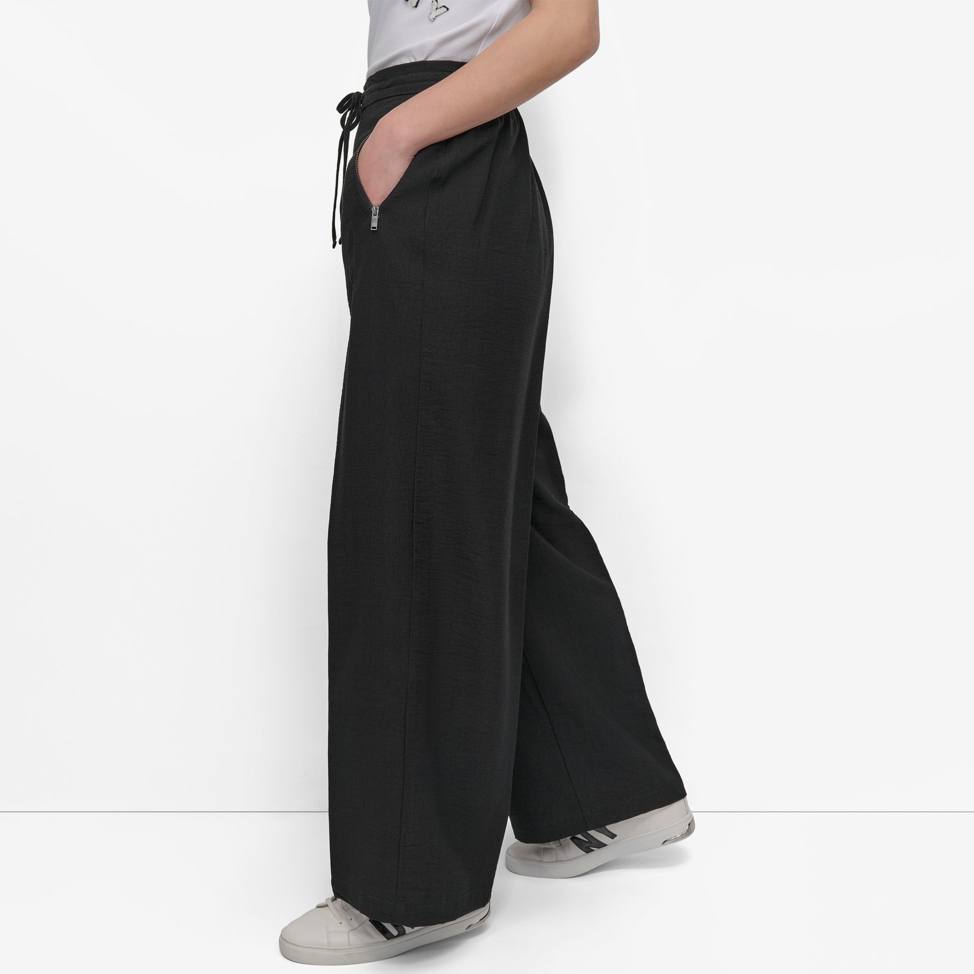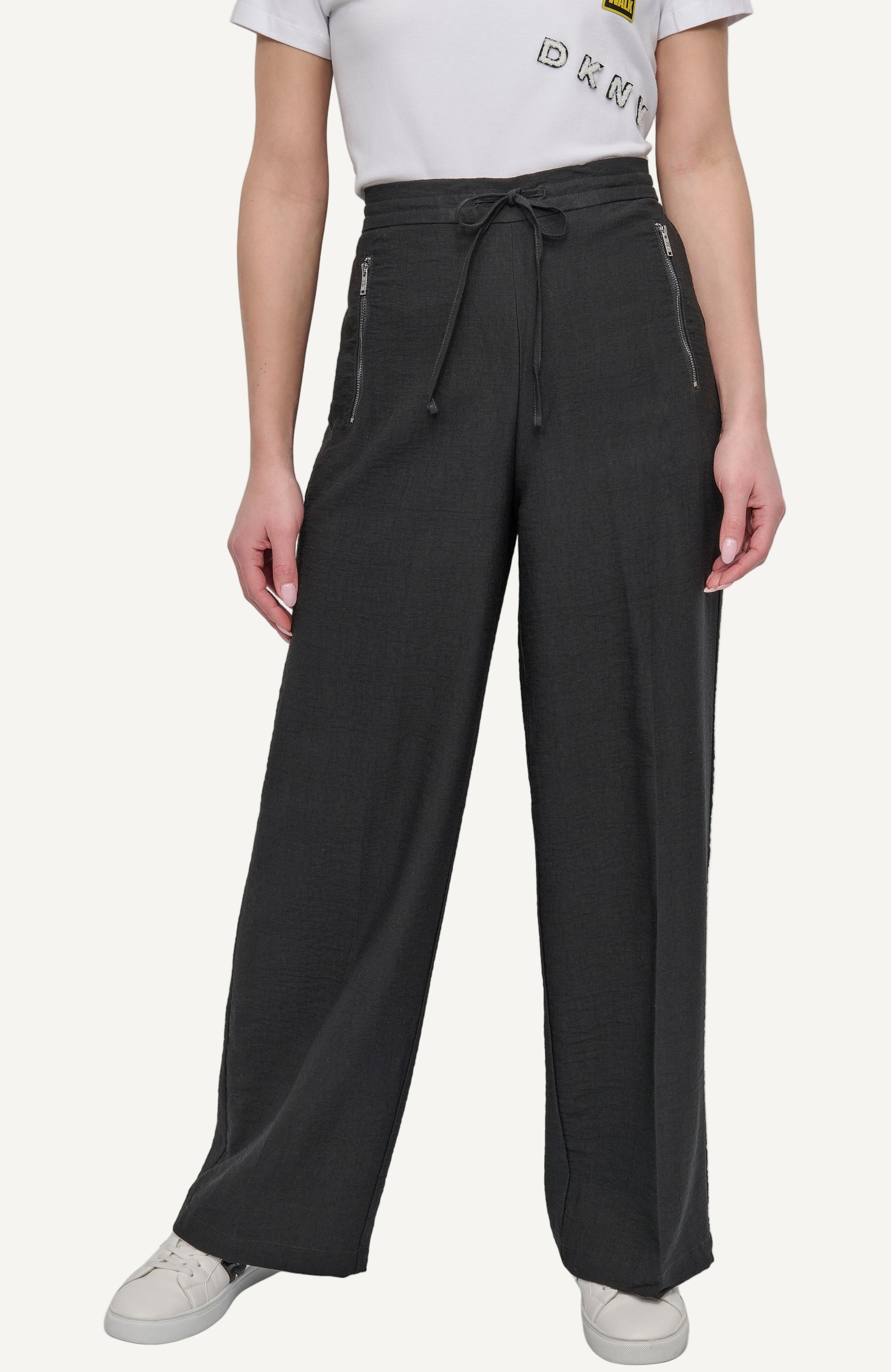 Effortlessly chic, the DKNY Pull On Drawstring Pants in classic black offer modern comfort with a relaxed fit. Featuring an adjustable waist and sleek silhouette, they're perfect for versatile styling, from casual outings to polished, sophisticated looks.