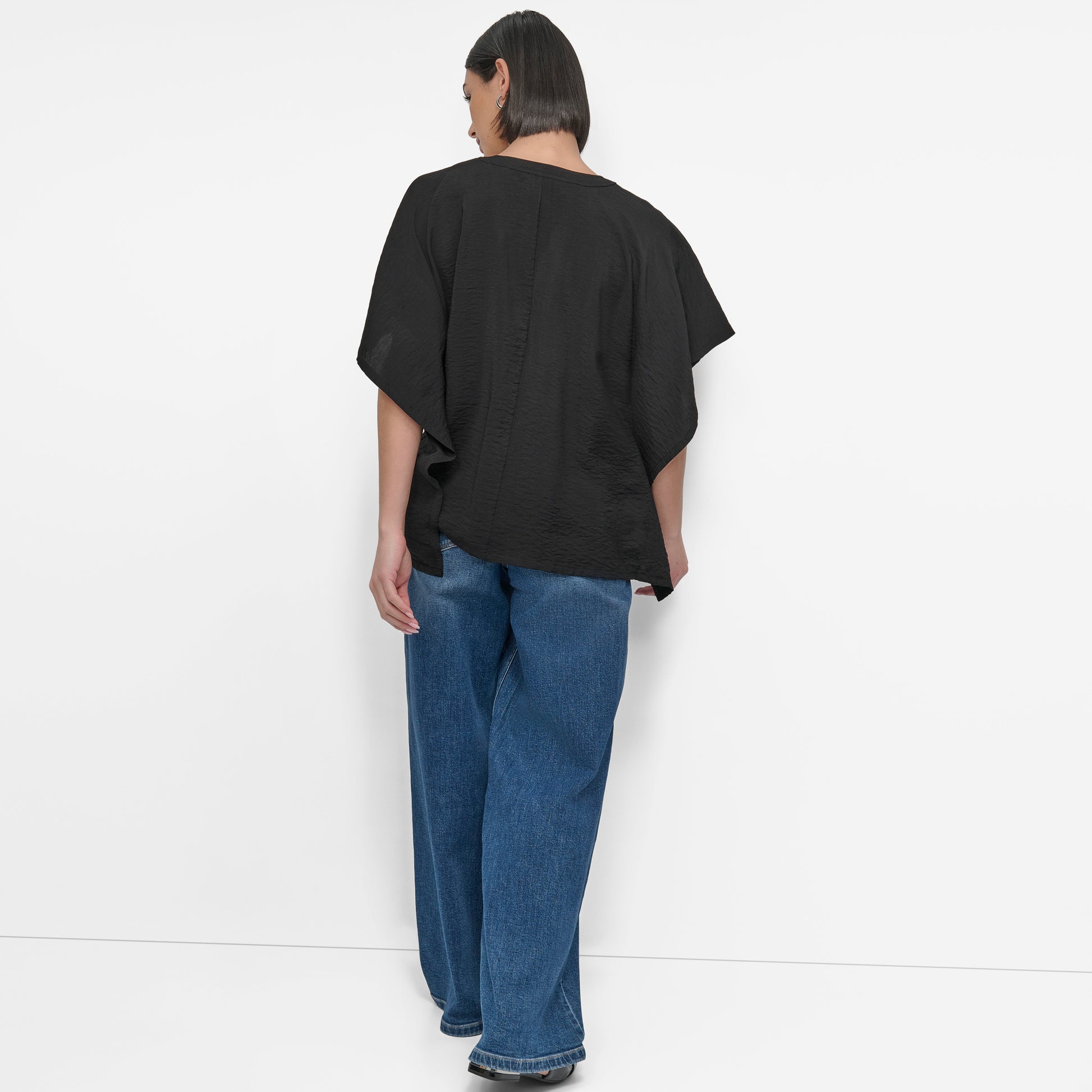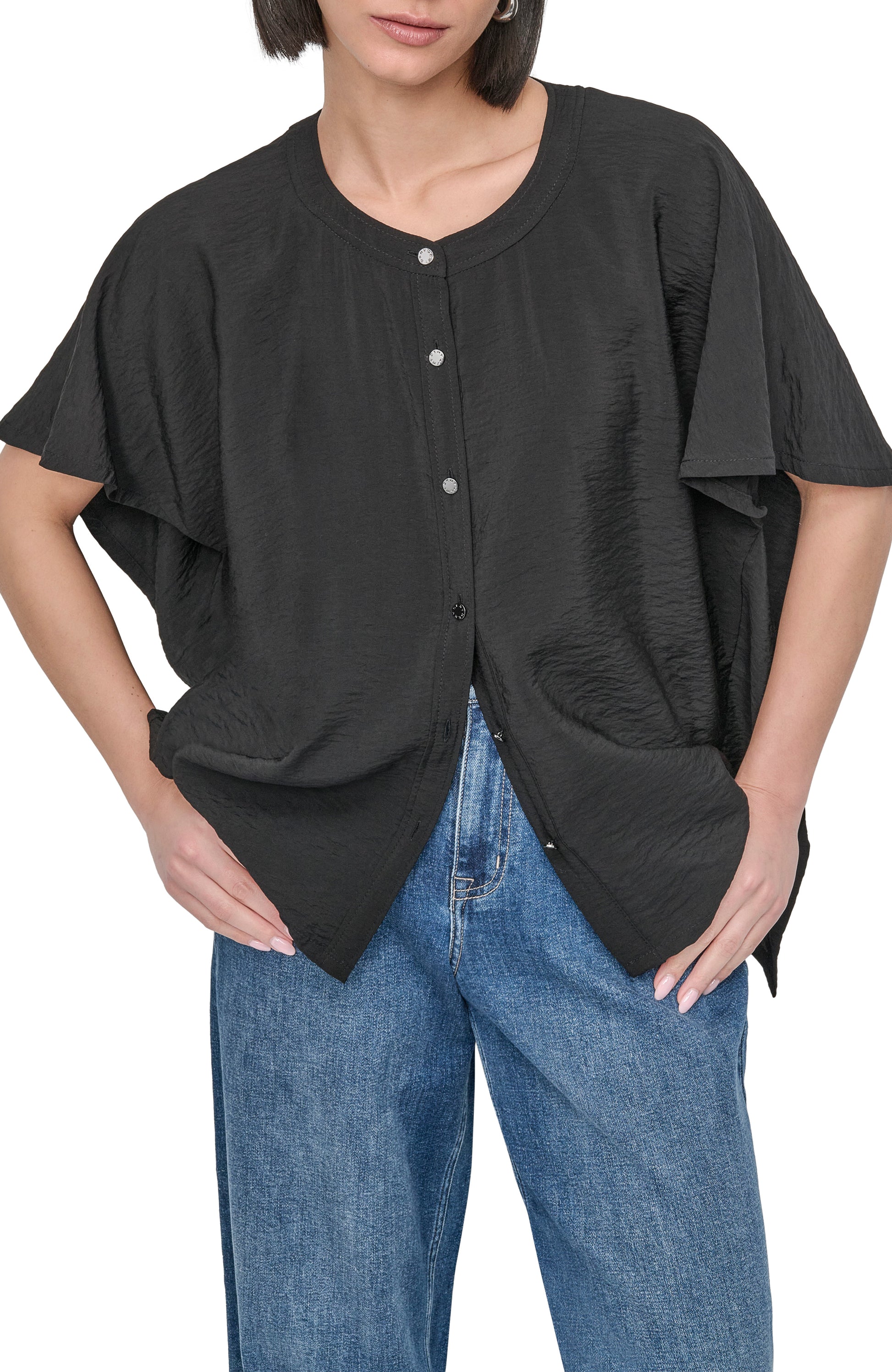 Elevate your wardrobe with this DKNY Flowy Rumpled Voile Shirt in classic black. Crafted from lightweight fabric, it features a relaxed silhouette and subtle rumpling for effortless style. Perfect for layering, this chic shirt seamlessly transitions from weekday to weekend.