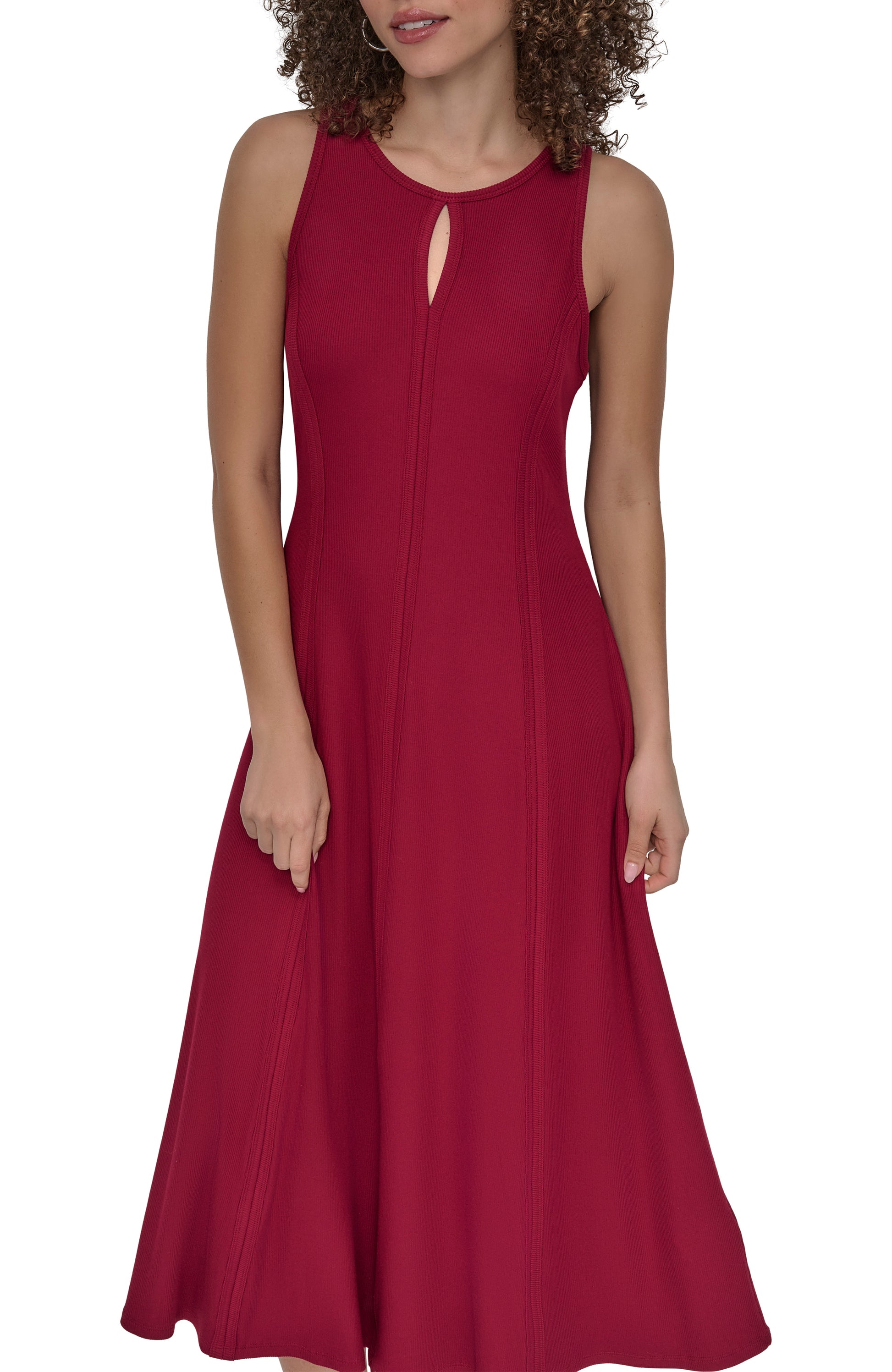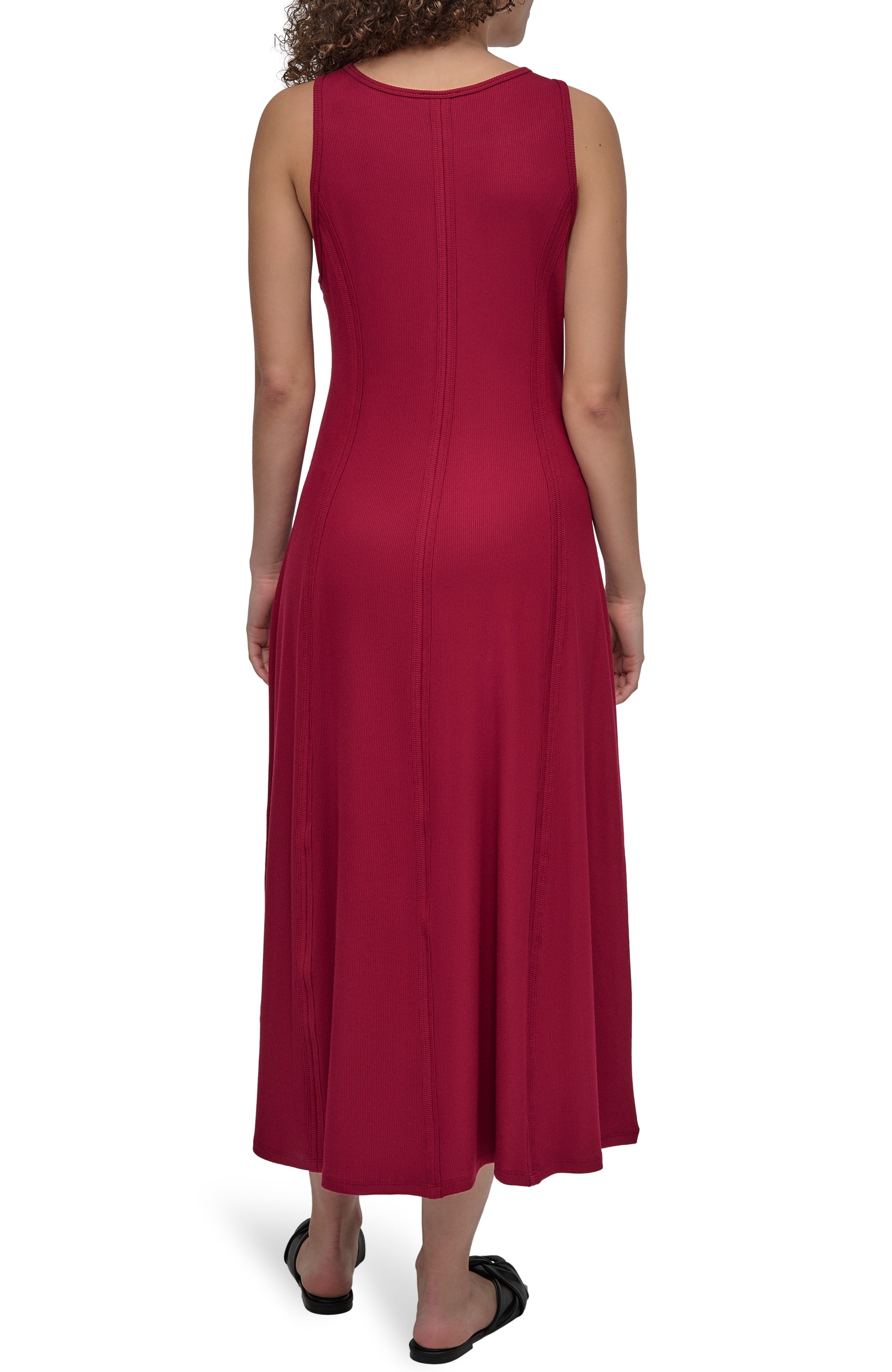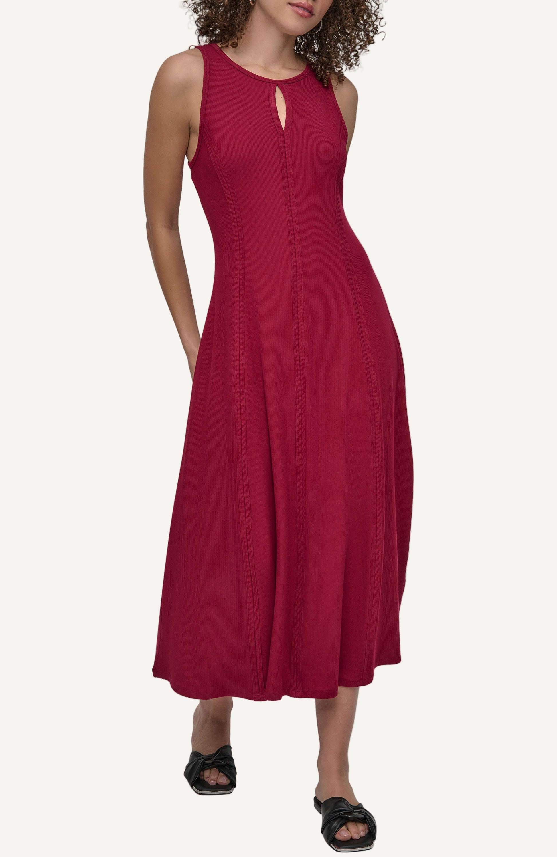 Elevate your wardrobe with the DKNY Maxi 2x2 Rib Dress in striking purple. This sleeveless, figure-flattering dress features ribbed knit texture, a comfortable stretch fit, and a classic silhouette-perfect for daytime charm or evening sophistication. Ideal for any occasion.