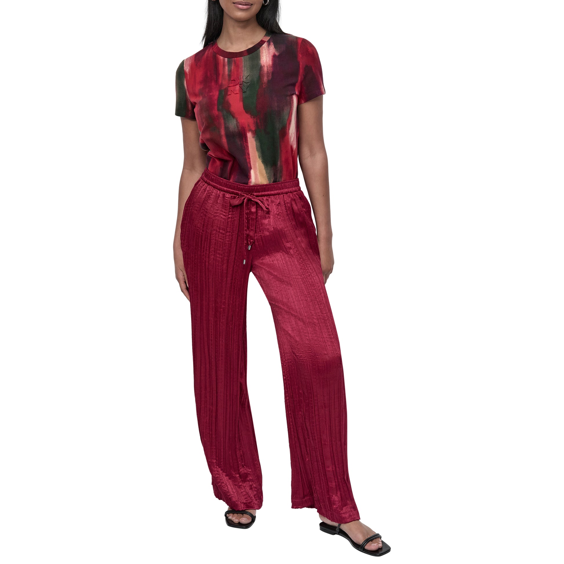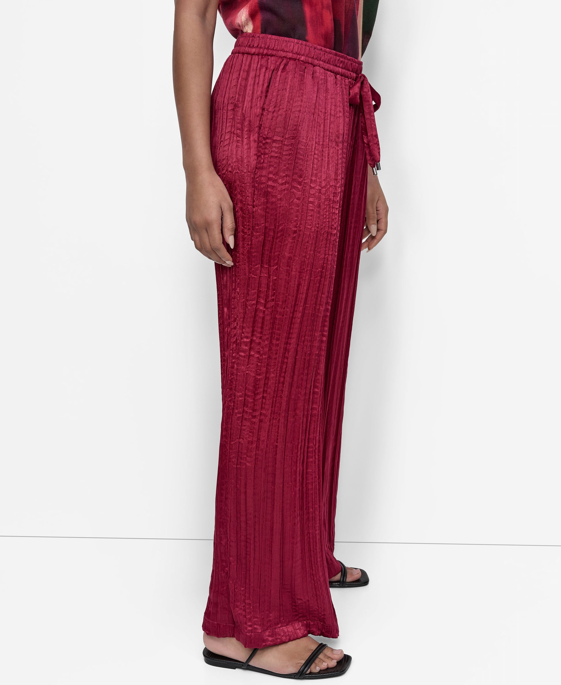 Make a bold statement with DKNY's Crushed Crease Wide Pant in stunning purple. Featuring a modern crushed texture and a relaxed wide-leg fit, these pants effortlessly combine style and comfort-perfect for both elevated evenings and chic everyday wear.