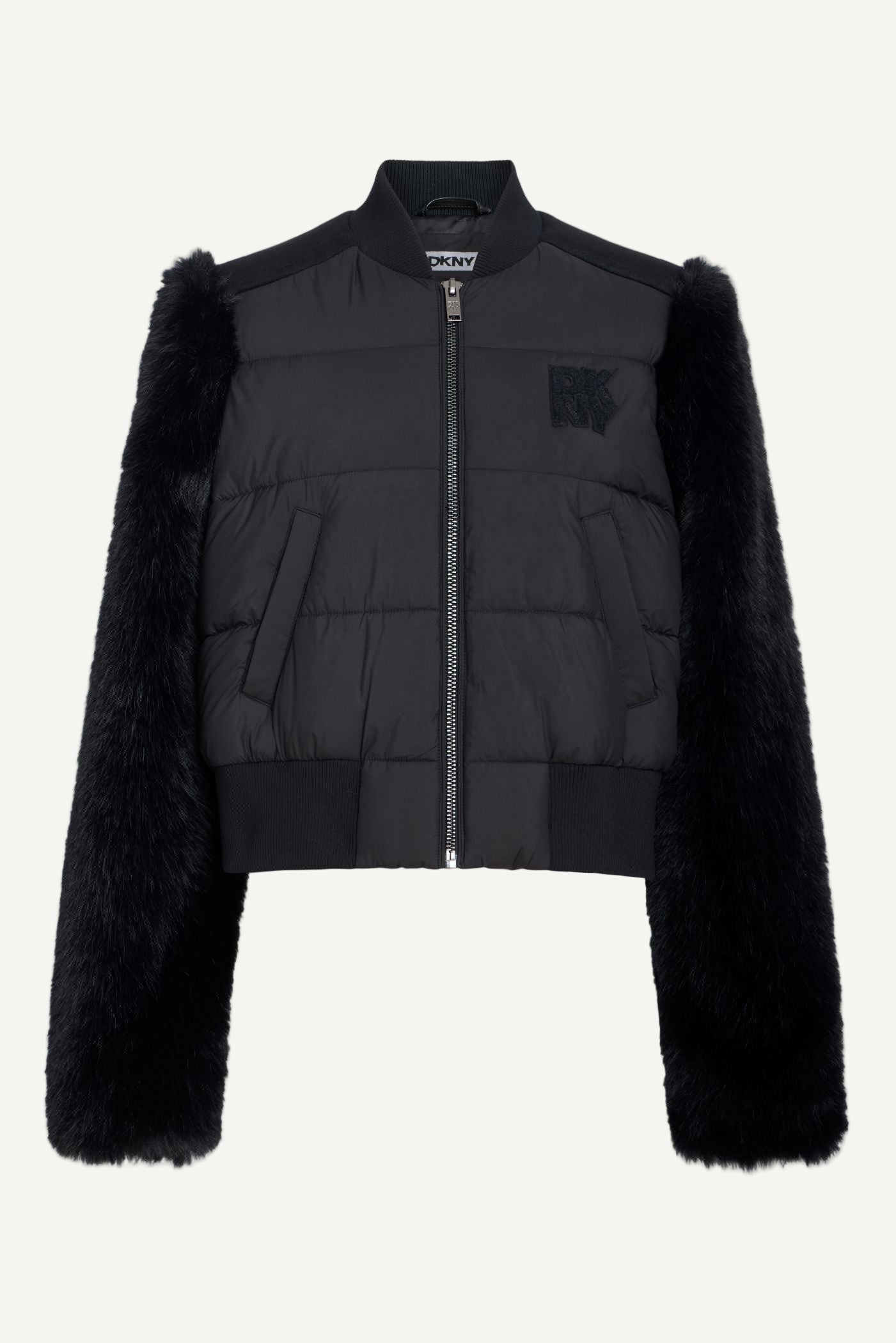 This Cropped Bomber Jacket by DKNY combines a refined blend of materials for durability and style. Featuring a 100% polyester shell and sleeves, with a yoke crafted from a sophisticated 95% wool and 5% nylon mix, it offers warmth alongside a modern silhouette. Ideal for layering, this jacket delivers both comfort and a polished, contemporary look.
