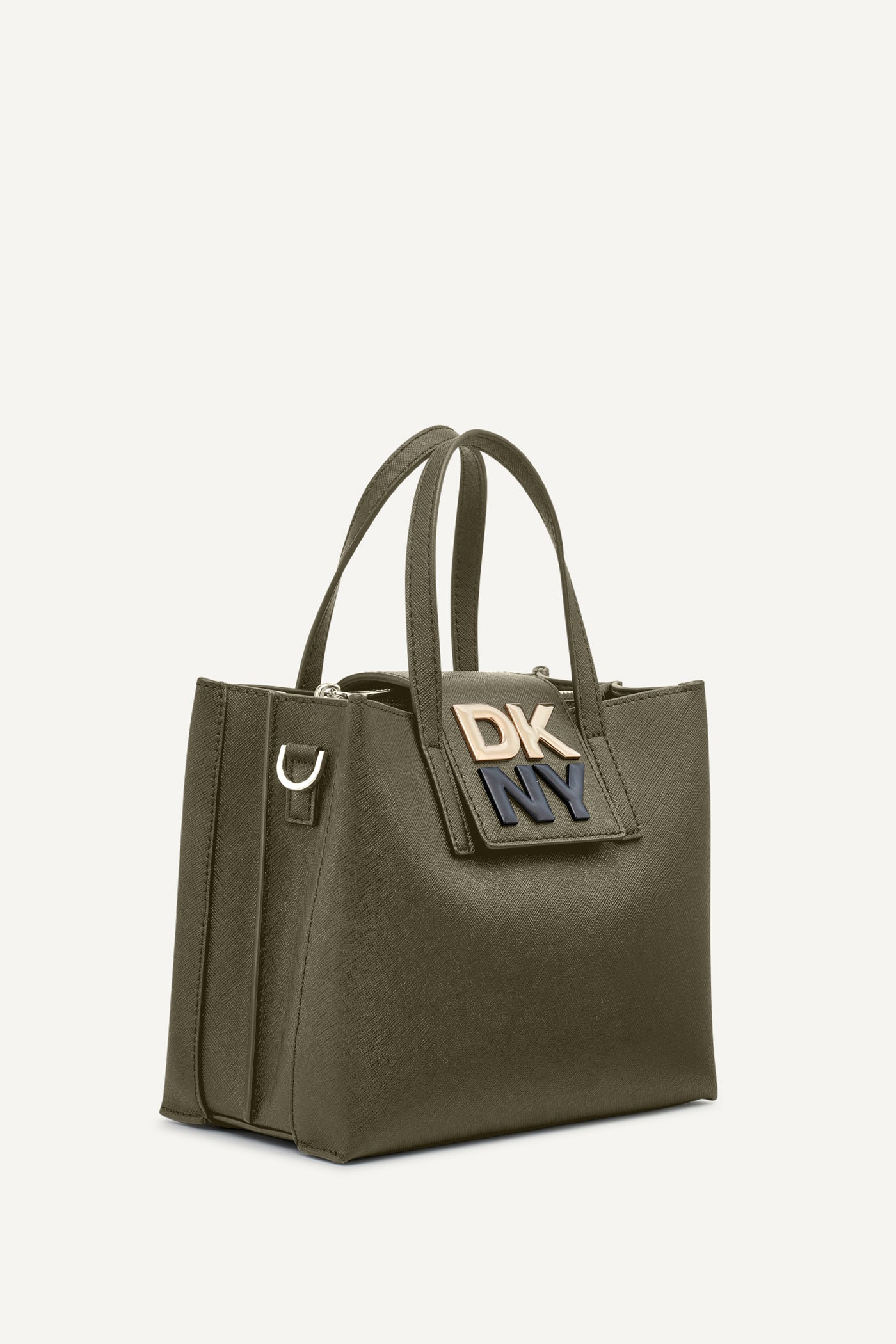 Make a bold style statement with the DKNY FAYE SMALL SATCHEL. This accessory features a prominent metallic logo plate, combining luxury and functionality. Perfect for elevating casual or dressy looks with effortless sophistication and contemporary edge.