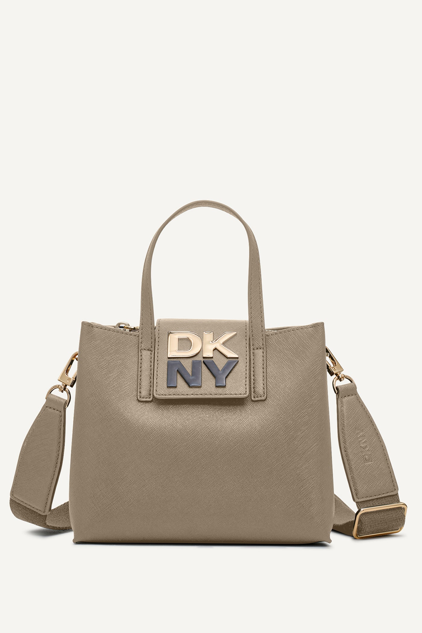 Elevate your style with the DKNY FAYE SMALL SATCHEL in classic brown. This elegant top handle bag features structured lines, luxe hardware, and a versatile silhouette-perfect for both day and evening outings. A sophisticated statement accessory for every wardrobe.