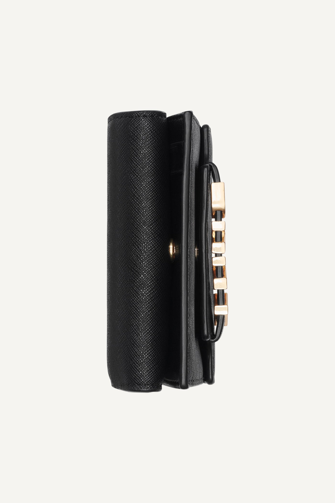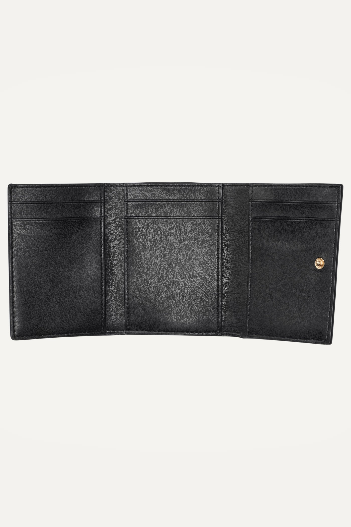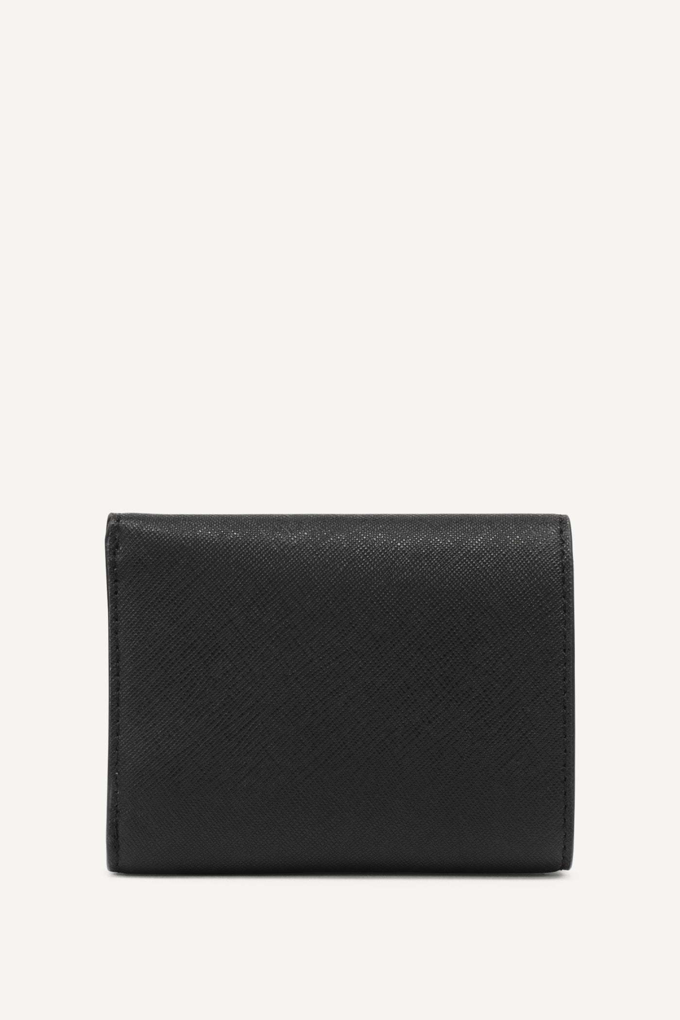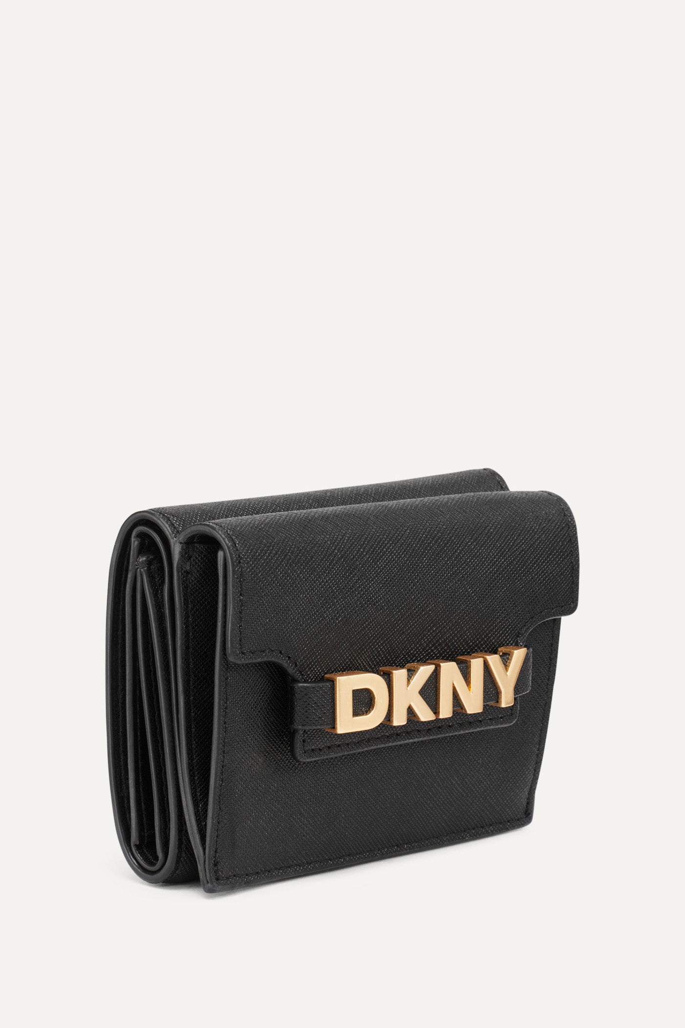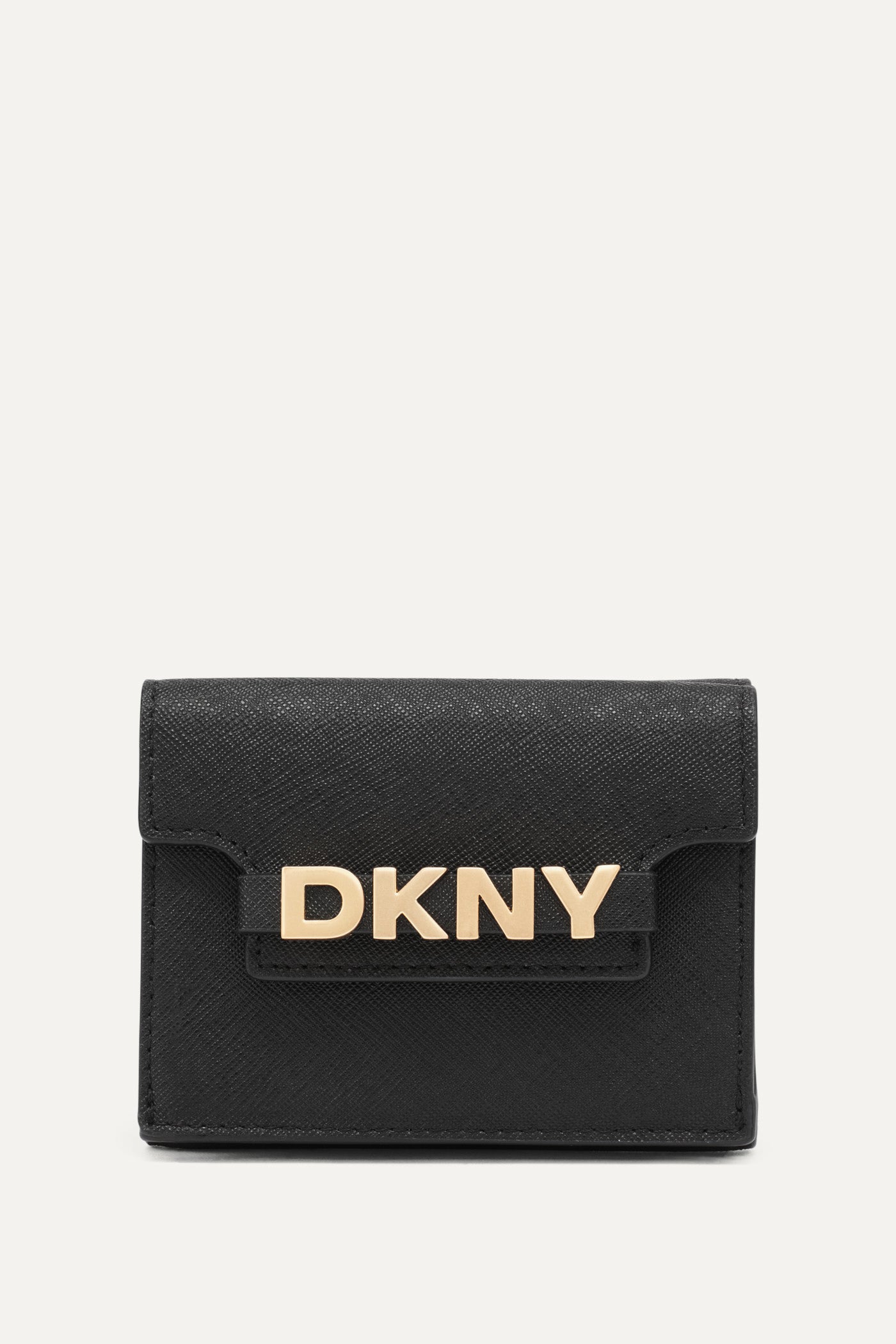 The AVRIL Tri-Fold Wallet by DKNY is crafted from 100% cow leather coated with 100% polyurethane, ensuring durability and a refined finish. Its tri-fold design offers organized storage with multiple card slots, a clear ID window, and a secure bill compartment, combining expert craftsmanship with functional elegance for everyday use.