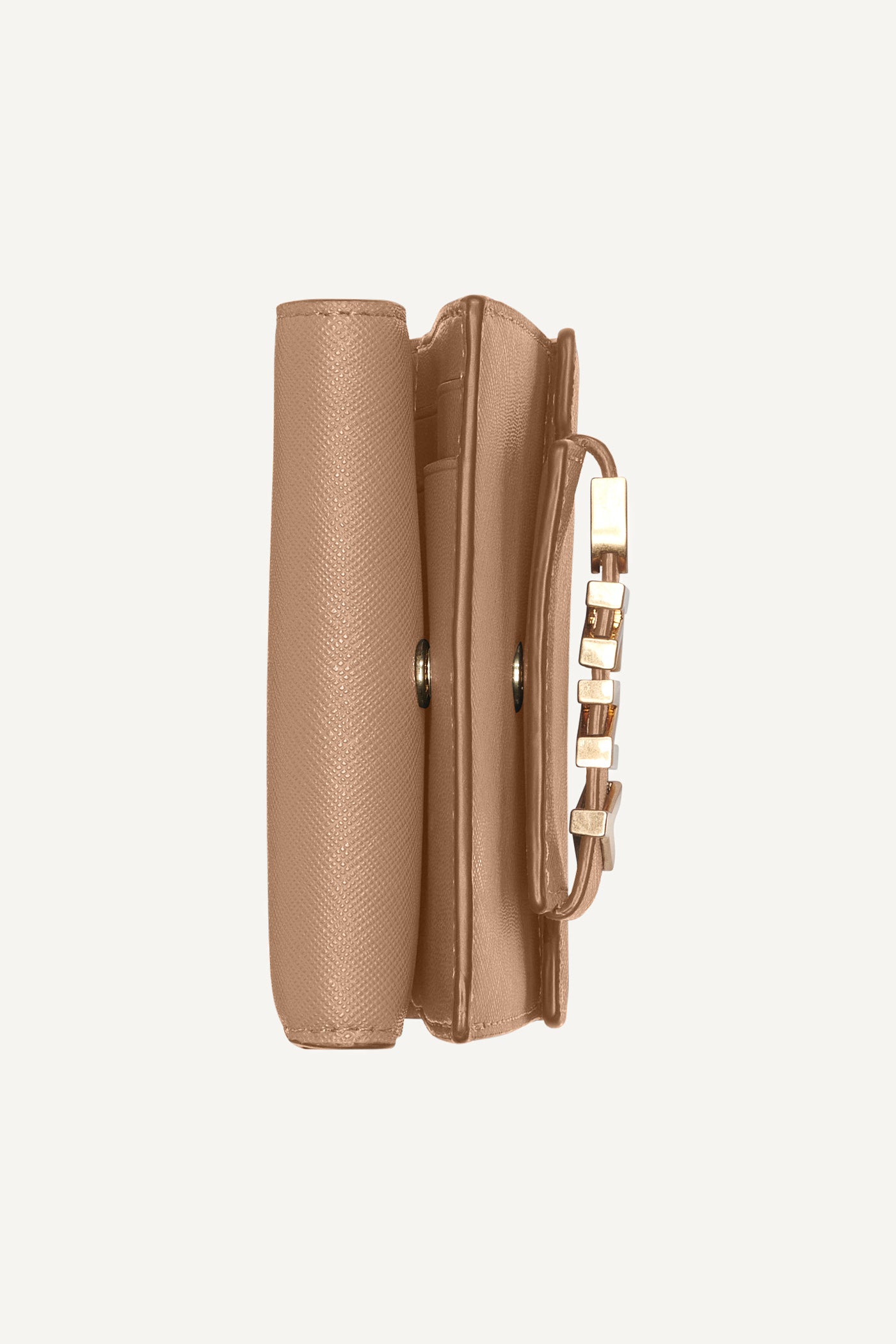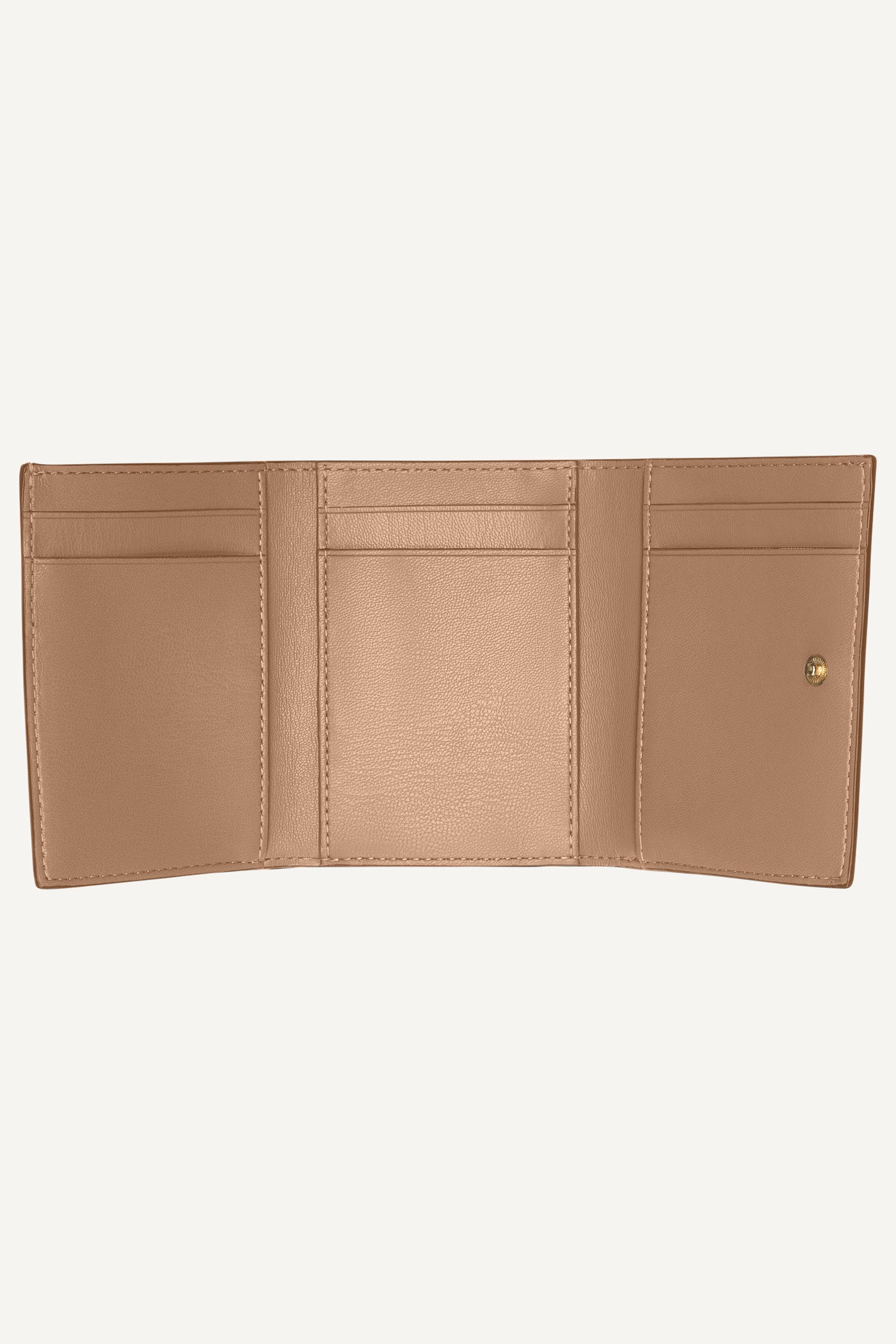 The AVRIL Tri-Fold Wallet by DKNY is crafted from 100% cow leather coated with 100% polyurethane, ensuring durability and a refined finish. Its tri-fold design offers organized storage with multiple card slots, a clear ID window, and a secure bill compartment, combining expert craftsmanship with functional elegance for everyday use.