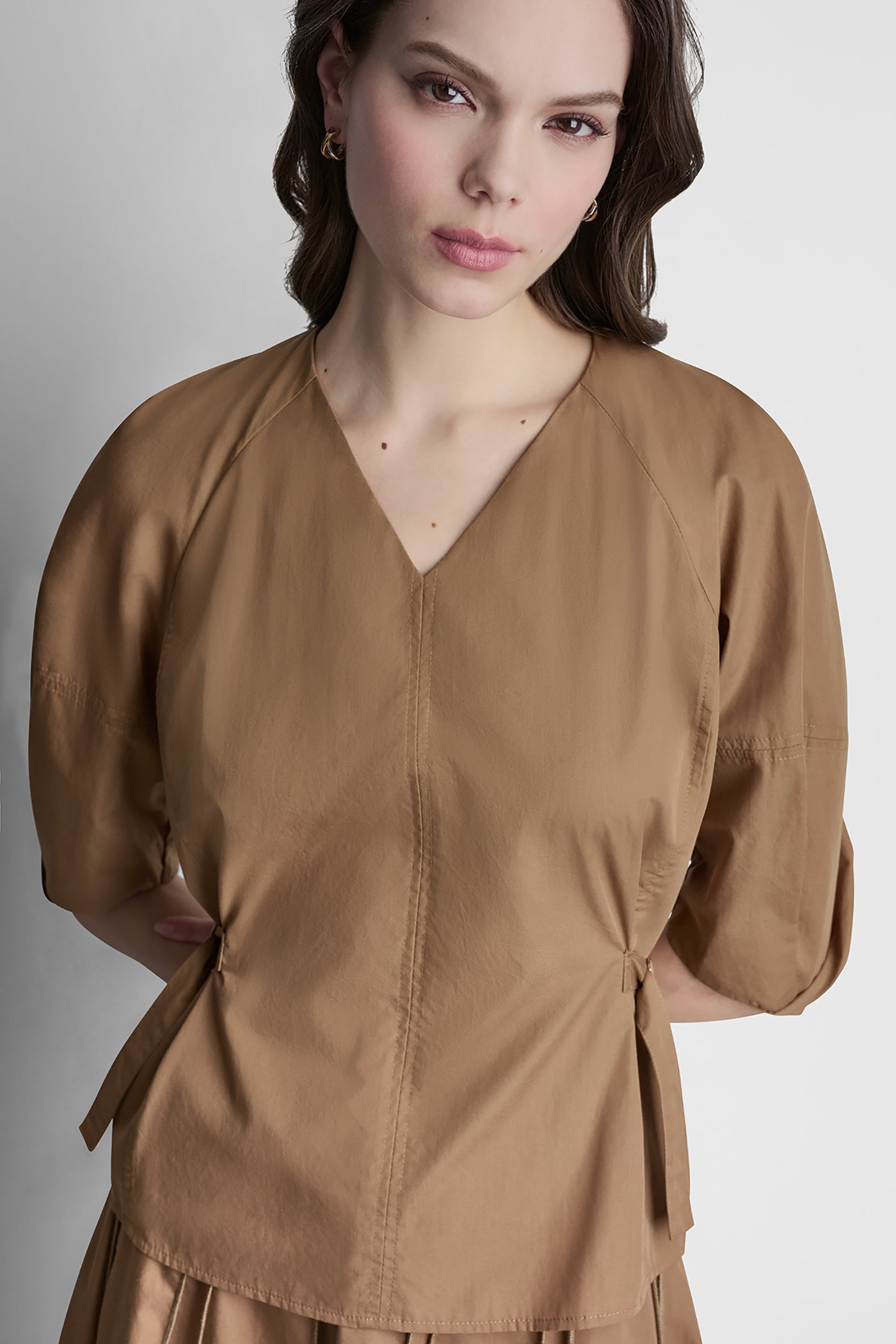 Elevate your wardrobe with this DKNY 3/4 barrel sleeve V-neck top in elegant beige. Crafted from soft, breathable fabric, it features a flattering silhouette ideal for versatile styling pair effortlessly with jeans or skirts for a refined, modern look. Item ID: P5KA7EKZIL3
