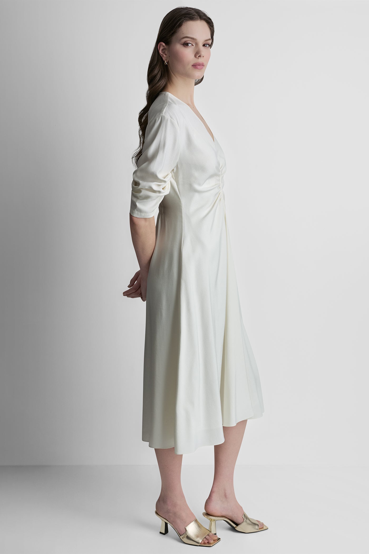 Elevate your wardrobe with the DKNY 3/4 Raushed XLV V-Neck Dress in classic white. Crafted from premium materials, this chic dress features flattering ruching, elegant three-quarter sleeves, and a sophisticated V-neckline perfect for both daytime and evening occasions. Item ID: P5KB8AD4IVY