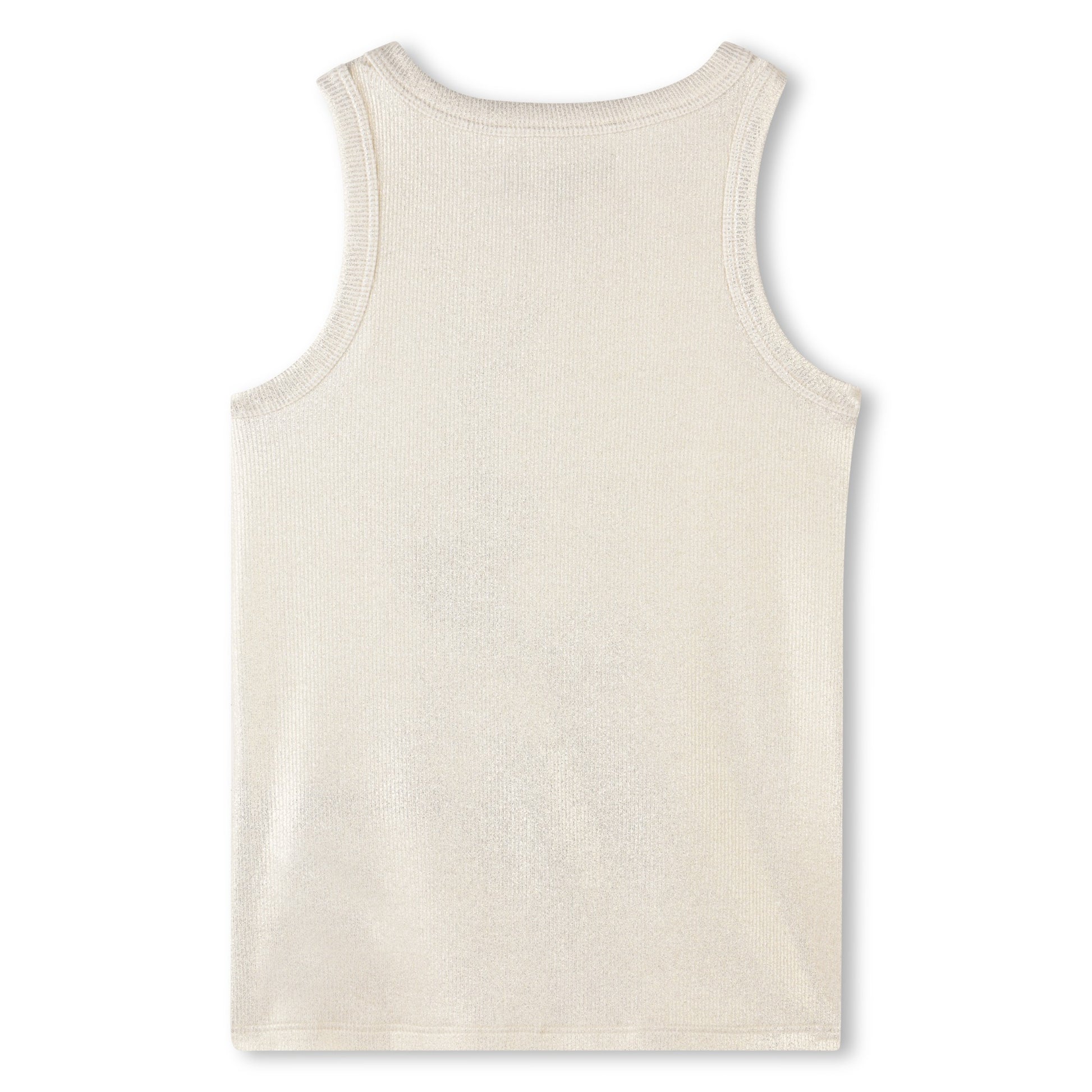 Tank top crafted from a 2x2 rib blend of 96% polyamide and 4% elastane, featuring a gold hue on the front. It includes a branded woven label prominently placed at the front.
