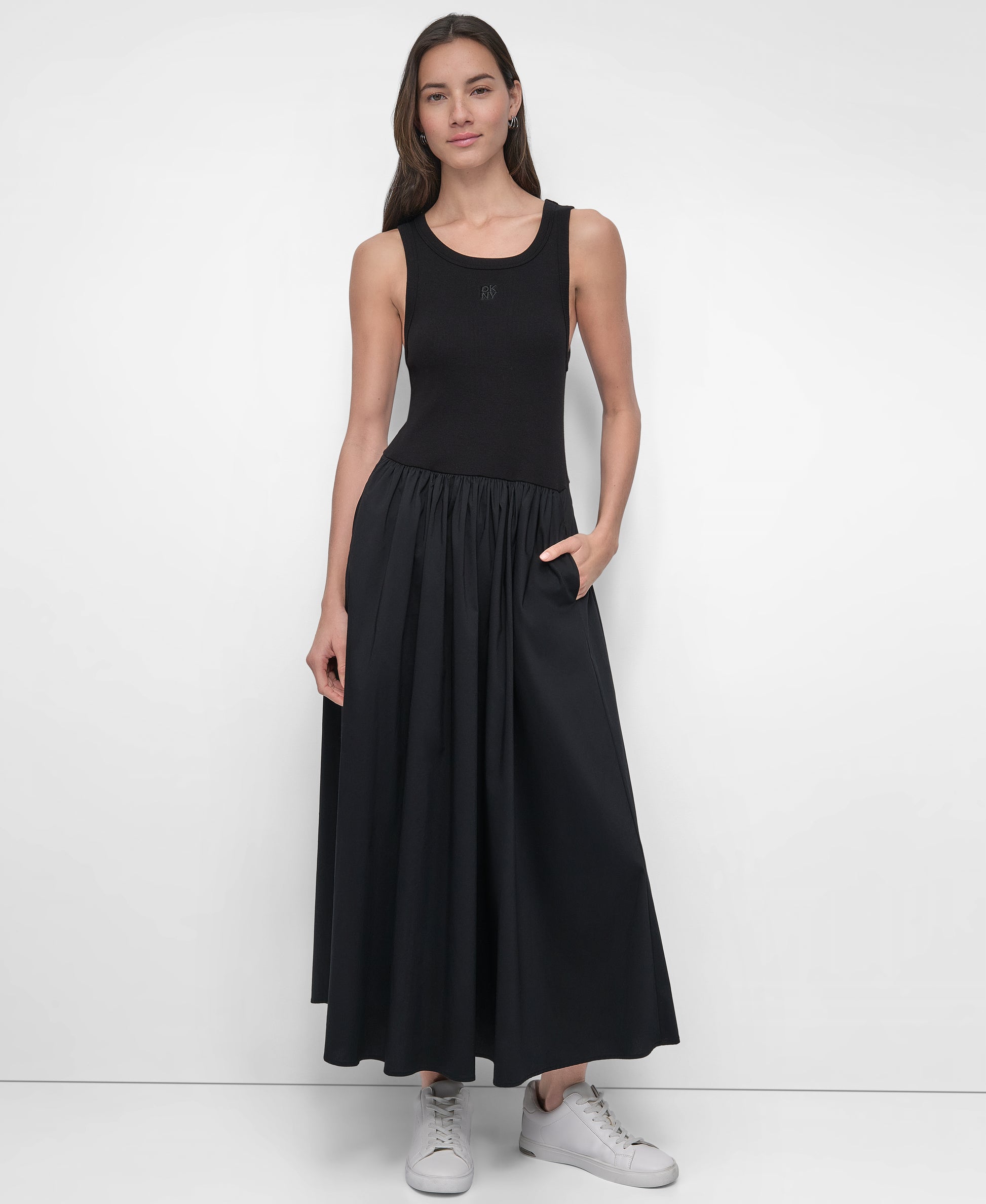 Effortlessly stylish, the DKNY Rib Tank Dress in classic black features a figure-flattering ribbed knit, designed for all-day comfort. Its sleeveless cut and knee-length silhouette make it perfect for layering or wearing solo for any occasion.