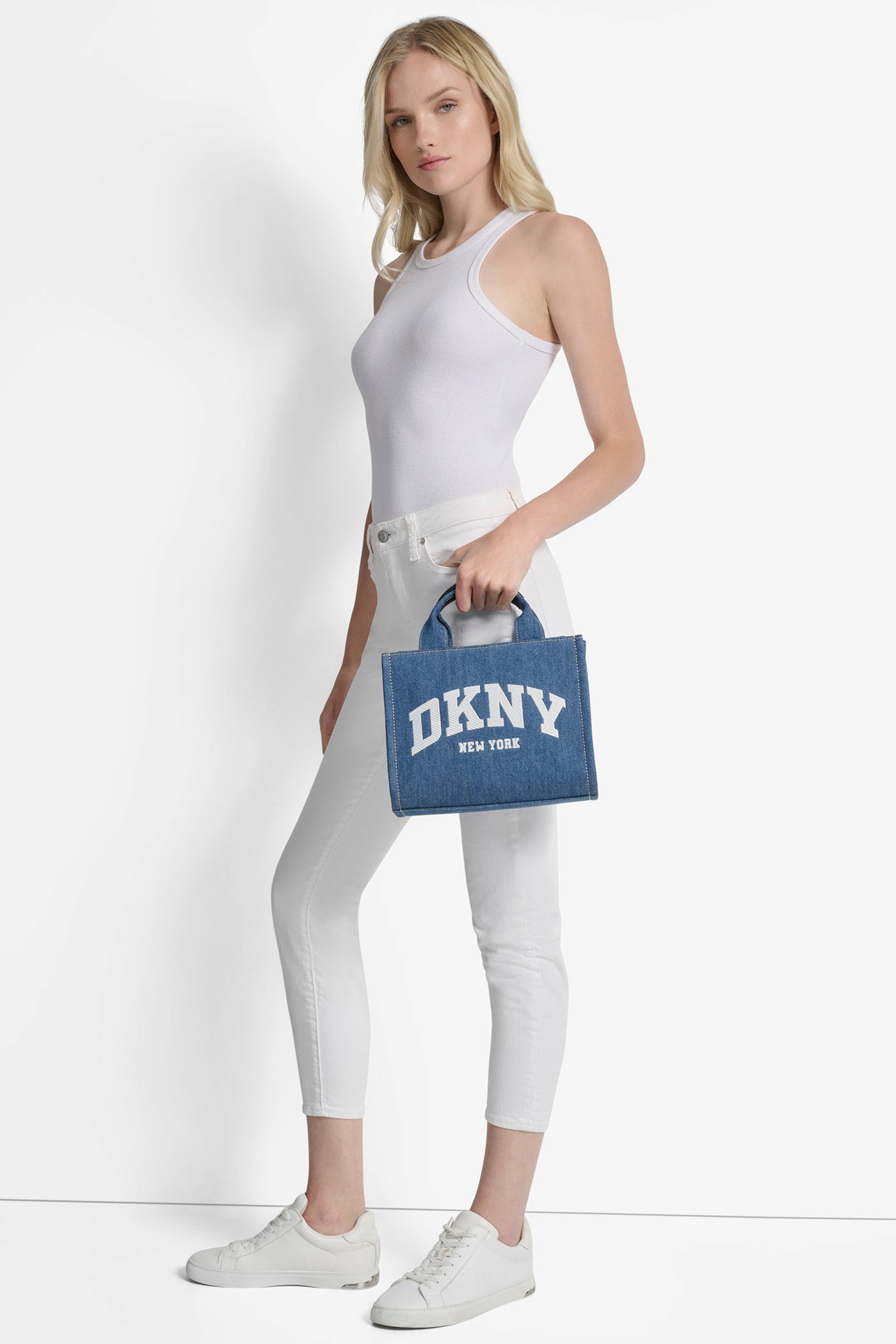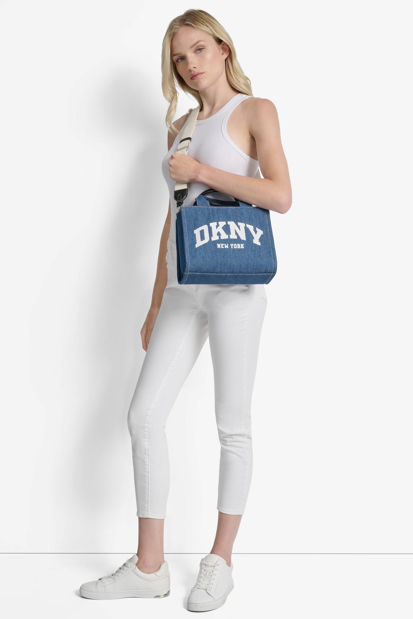 The DKNY Hadlee Small Tote in vibrant blue effortlessly combines style and function. Its spacious interior keeps your essentials organized, while chic gold-tone accents and dual drop handles offer sophistication. Perfect for elevating everyday looks or weekend outings with timeless flair.