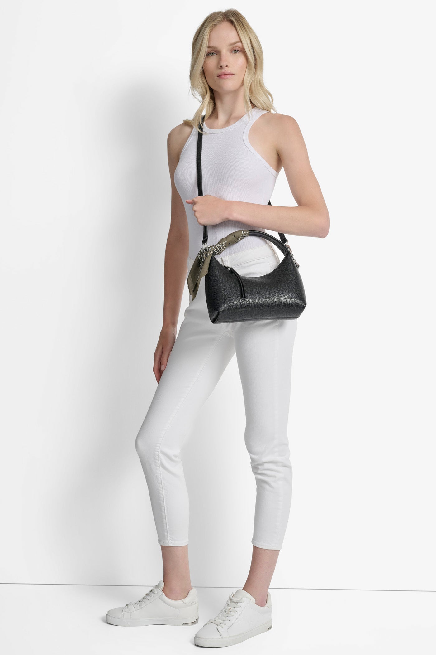 Elevate your style with the DKNY IMMA Crossbody in classic black. Compact yet spacious, this sleek crossbody bag features a secure zip closure, adjustable strap, and refined hardware-perfect for hands-free convenience and versatile everyday sophistication.