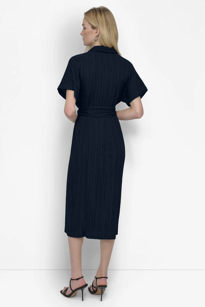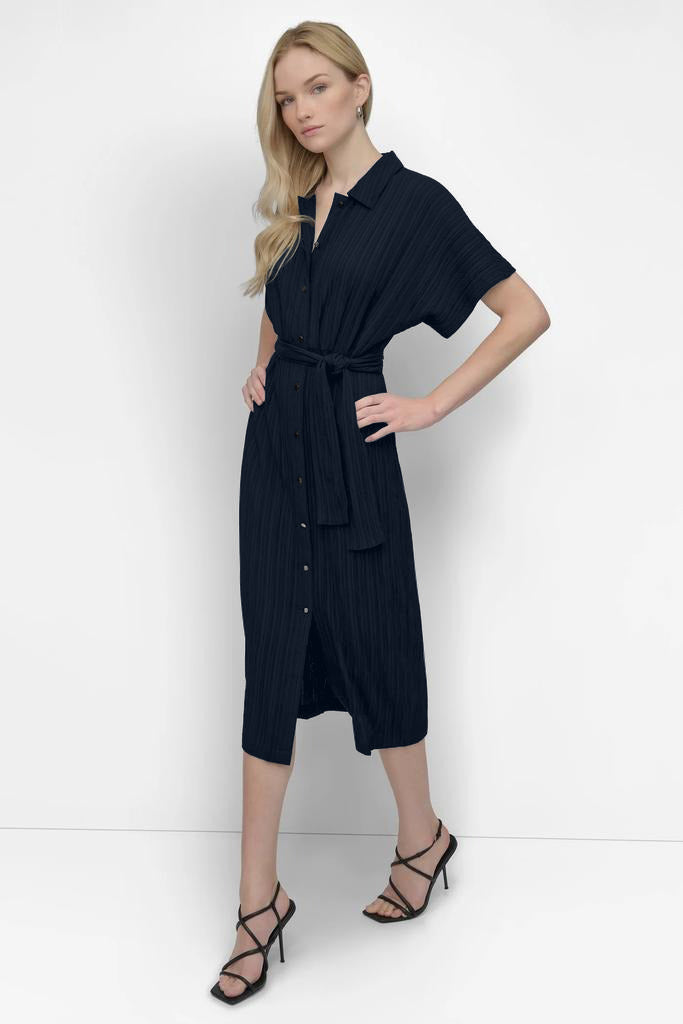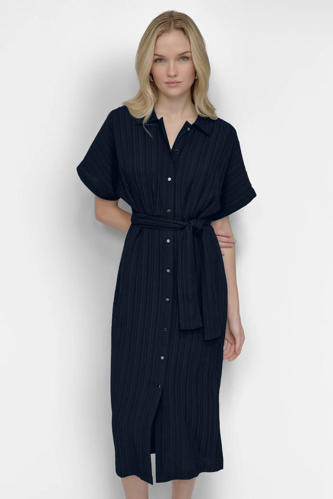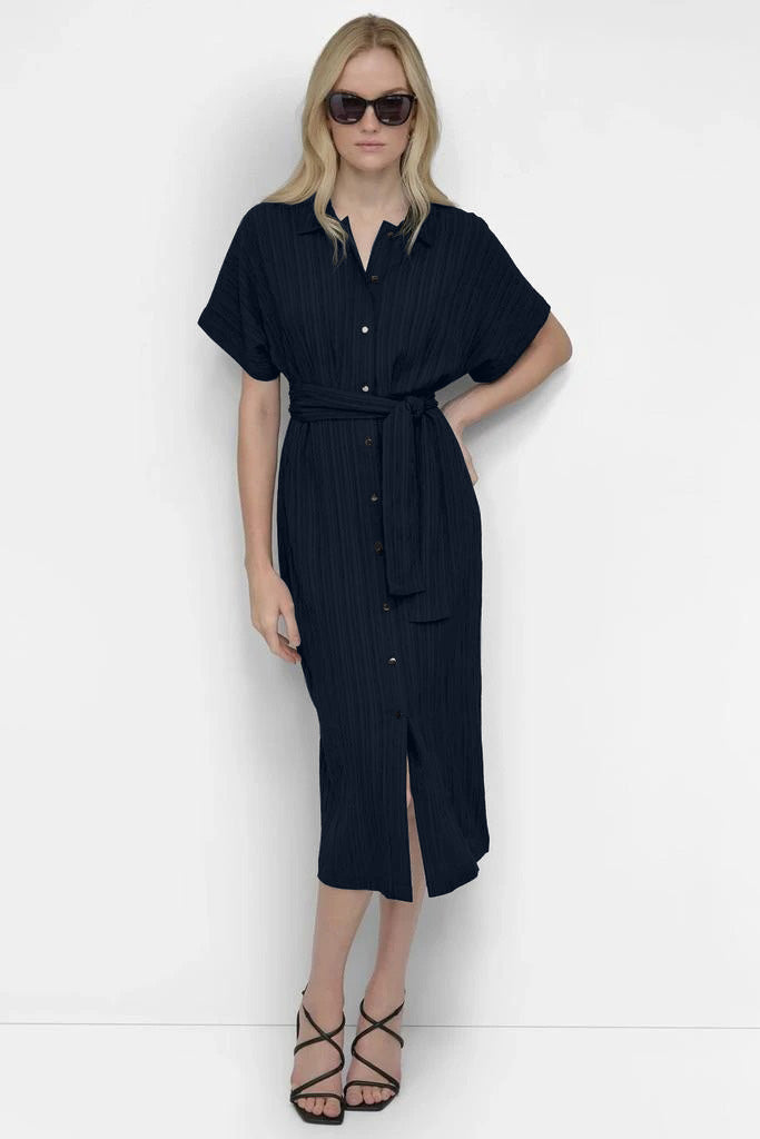 Add effortless flair to your wardrobe with the DKNY Tiered Buttoned Down Dress in blue. Featuring a flattering tiered silhouette and classic button-down front, this versatile piece transitions seamlessly from day to night for polished, modern style.