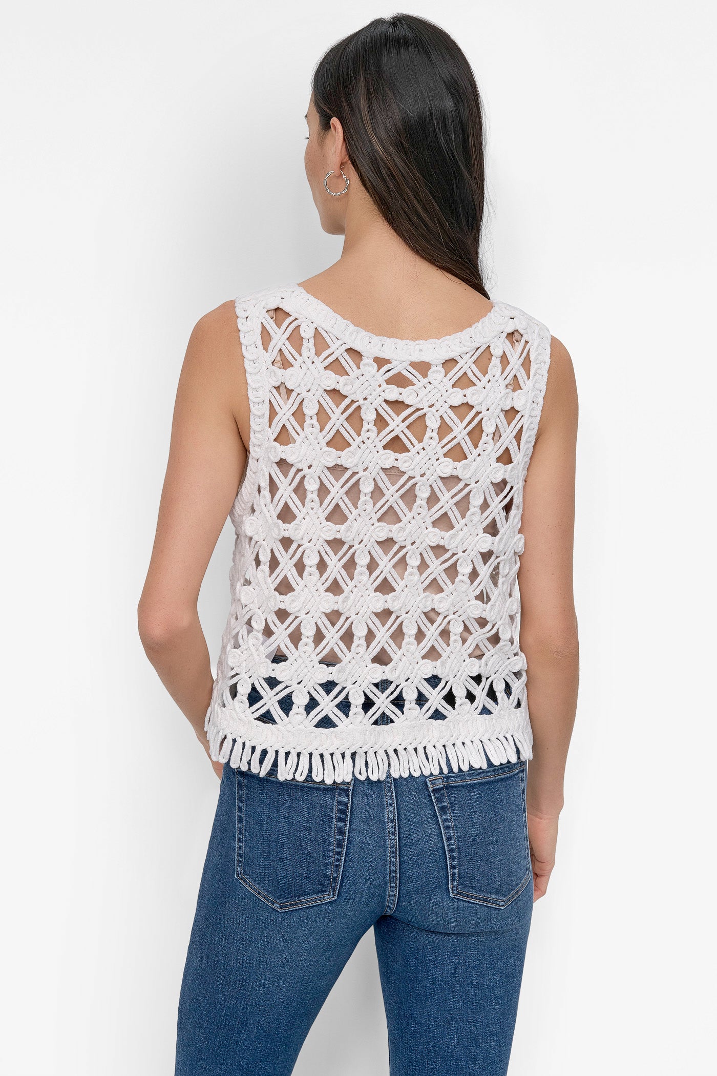 Elevate your wardrobe with the DKNY Crochet Scoop Neck Top in crisp white. Featuring intricate crochet detailing and a flattering scoop neckline, this versatile top effortlessly combines sophistication and comfort-perfect for layering or wearing solo, day or evening.