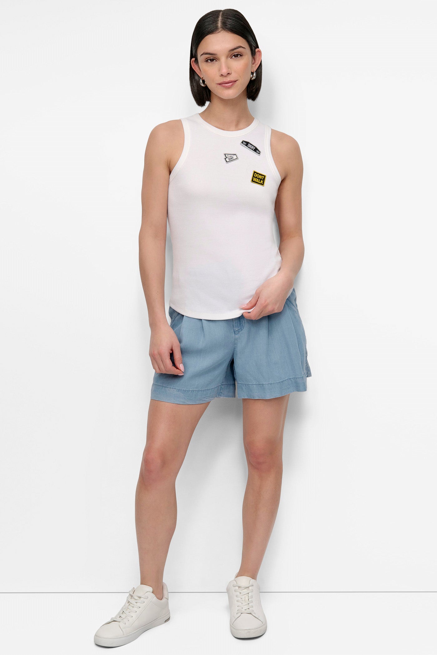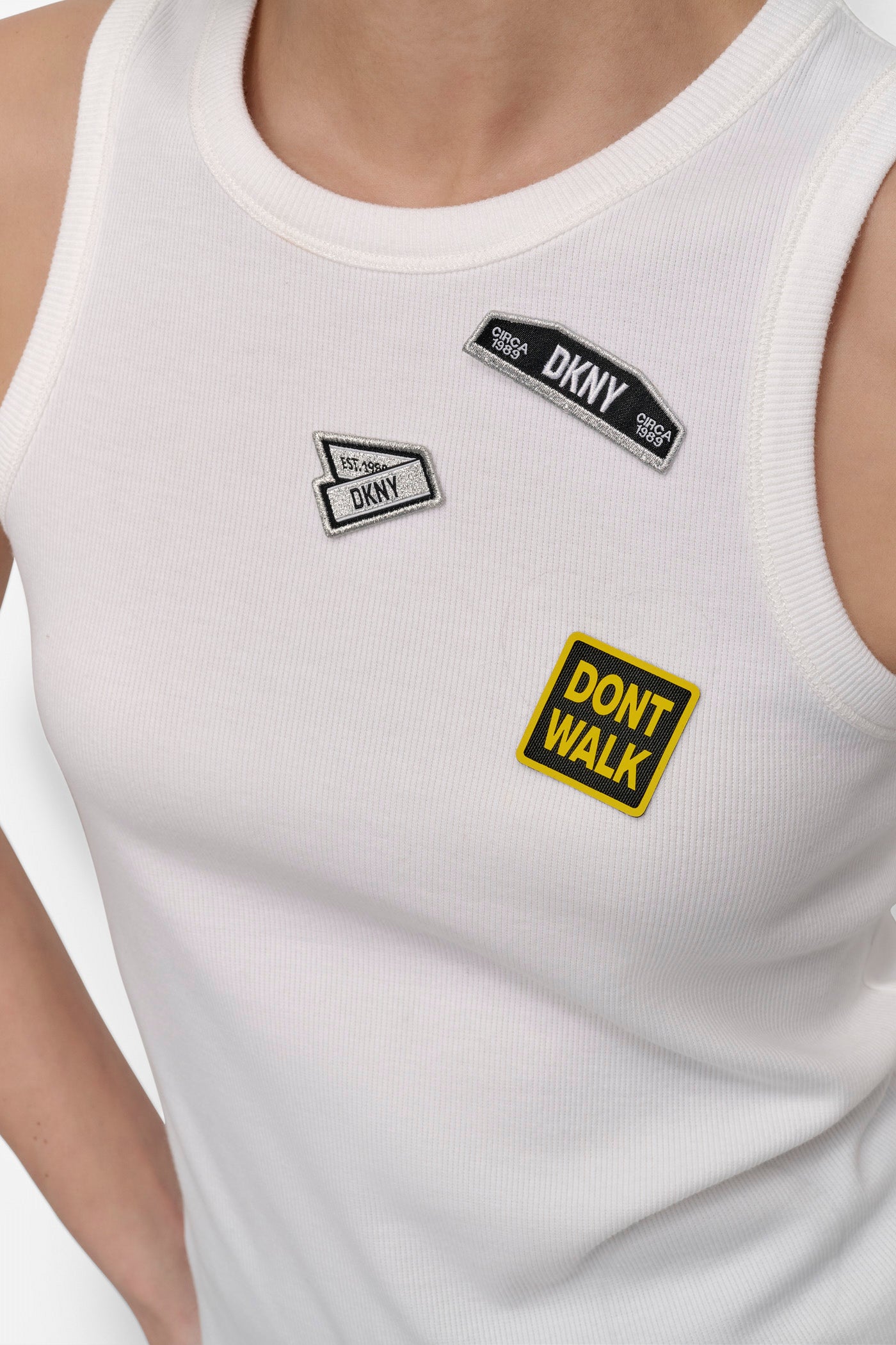 Add playful edge to your wardrobe with the DKNY PINS N PATCHES TEE in white. This soft, versatile top features chic, graphic pin and patch details, perfect for casual looks and stylish layering. Elevate your everyday style effortlessly.