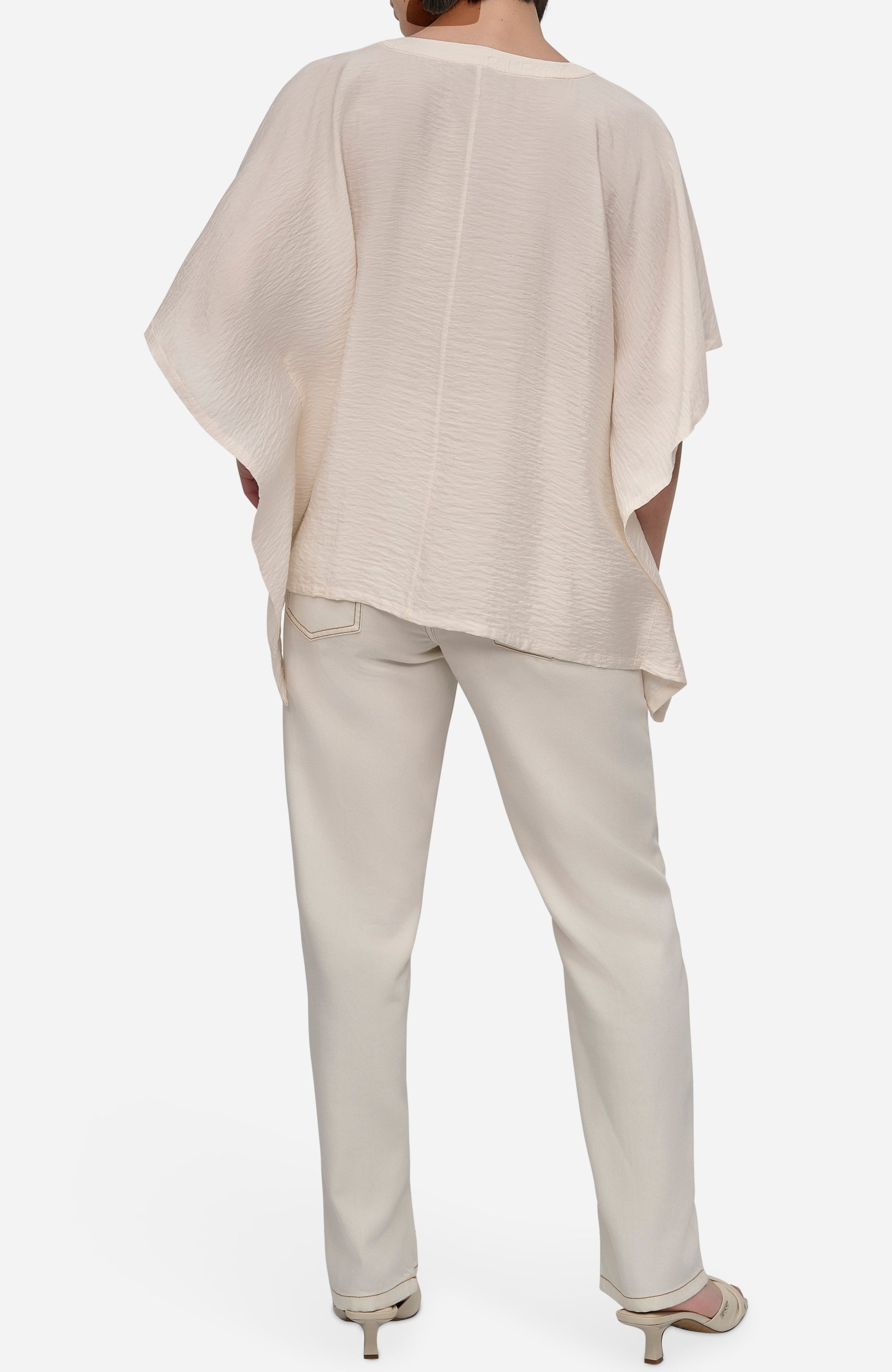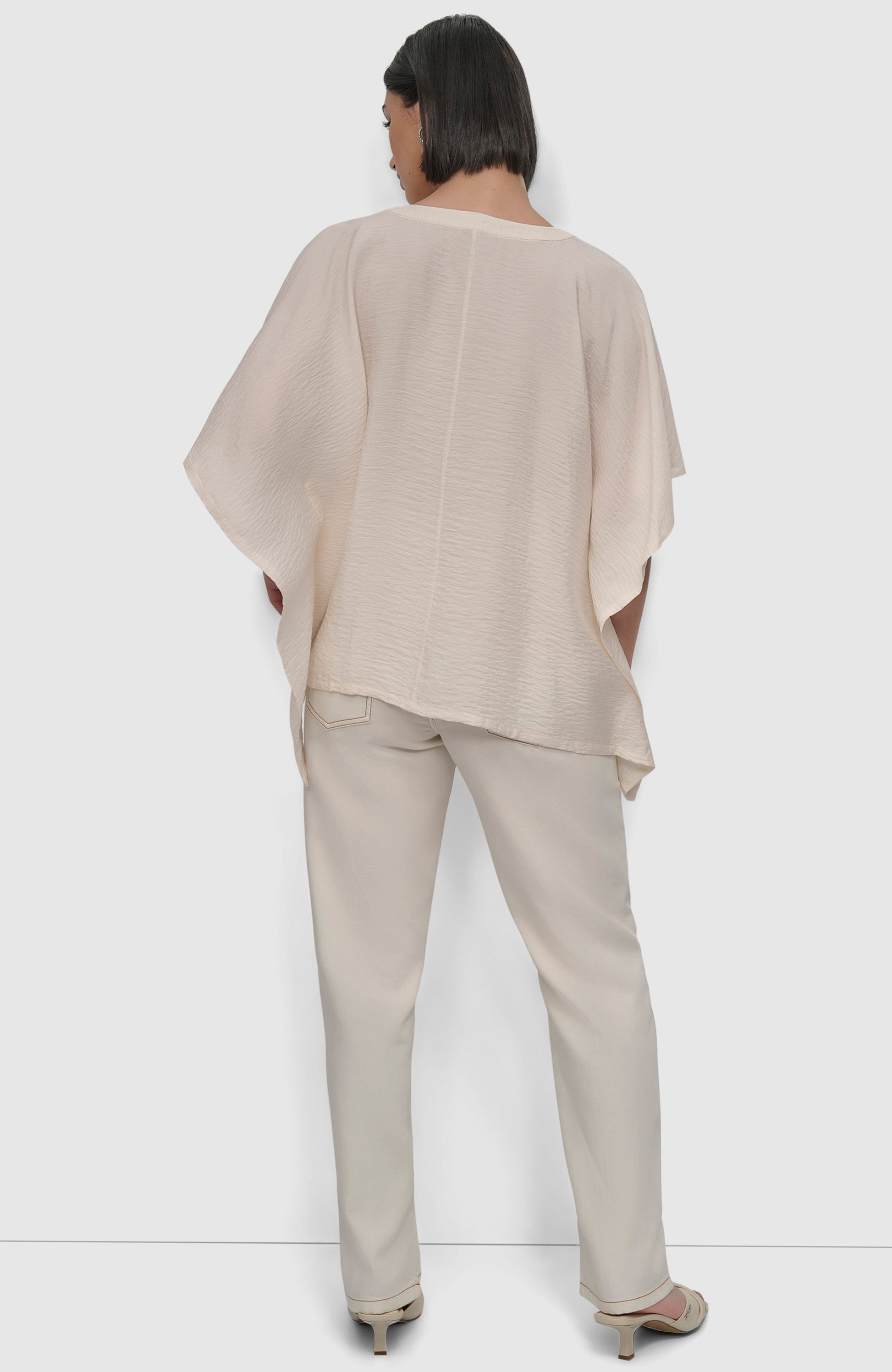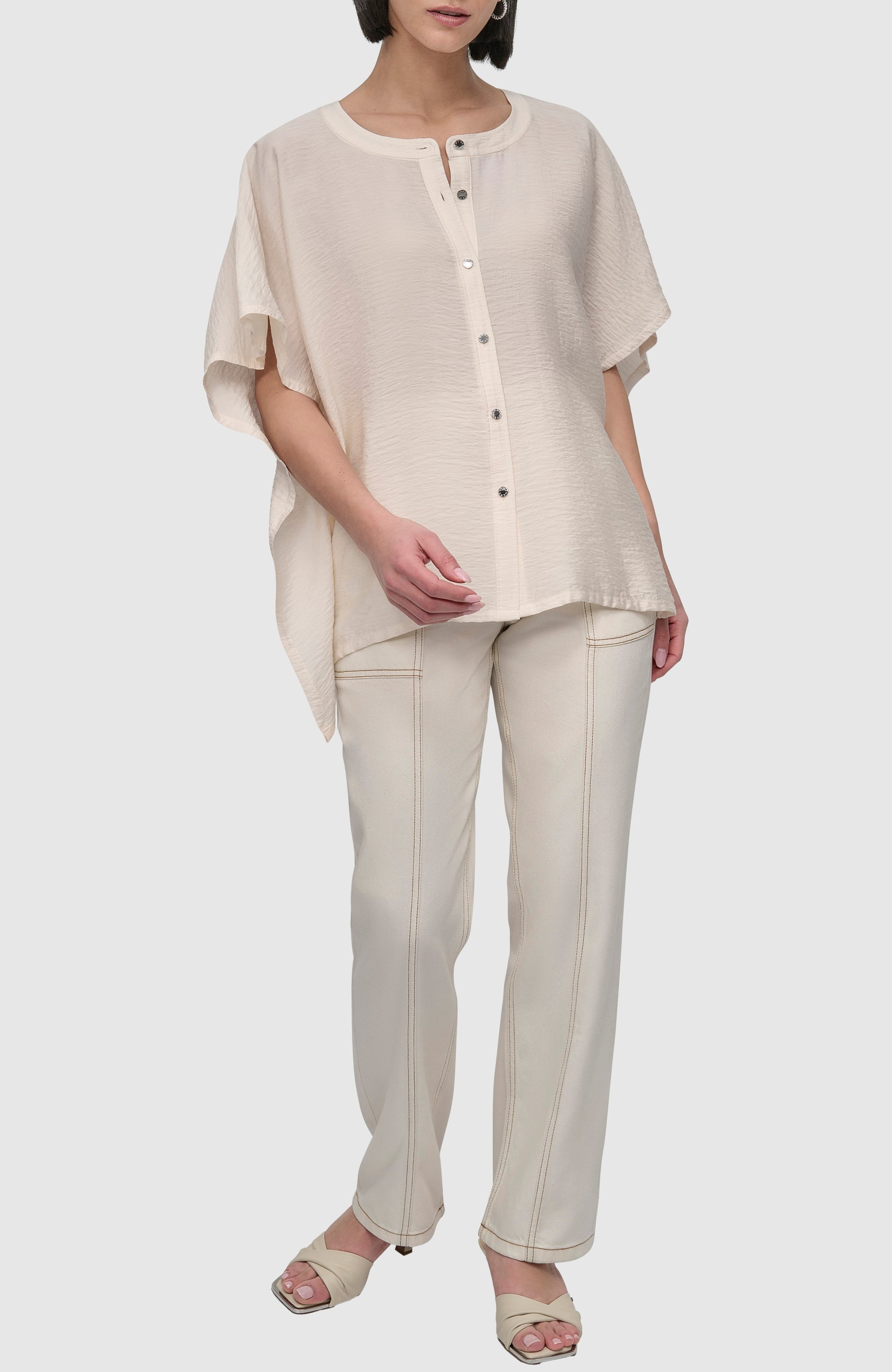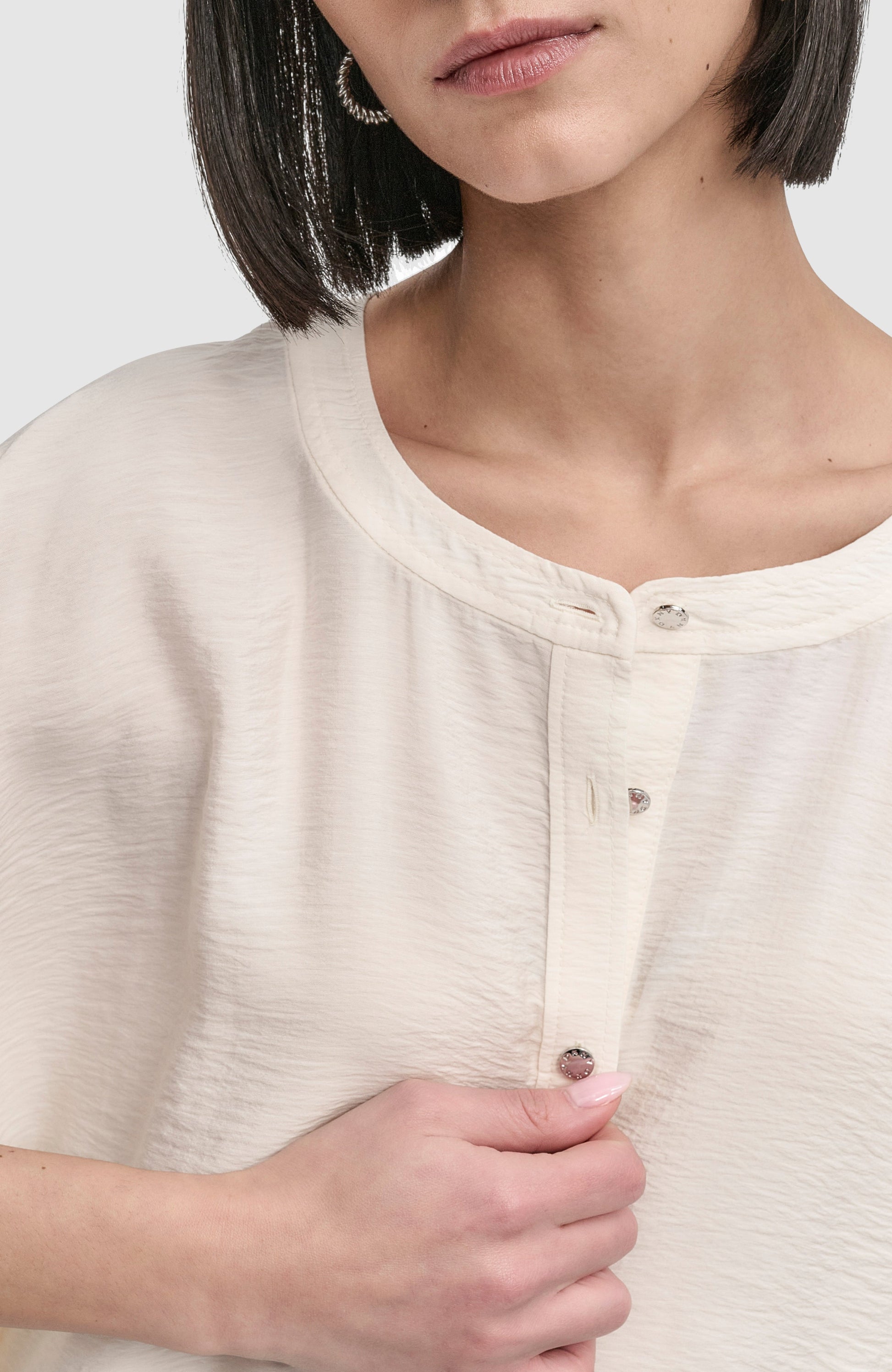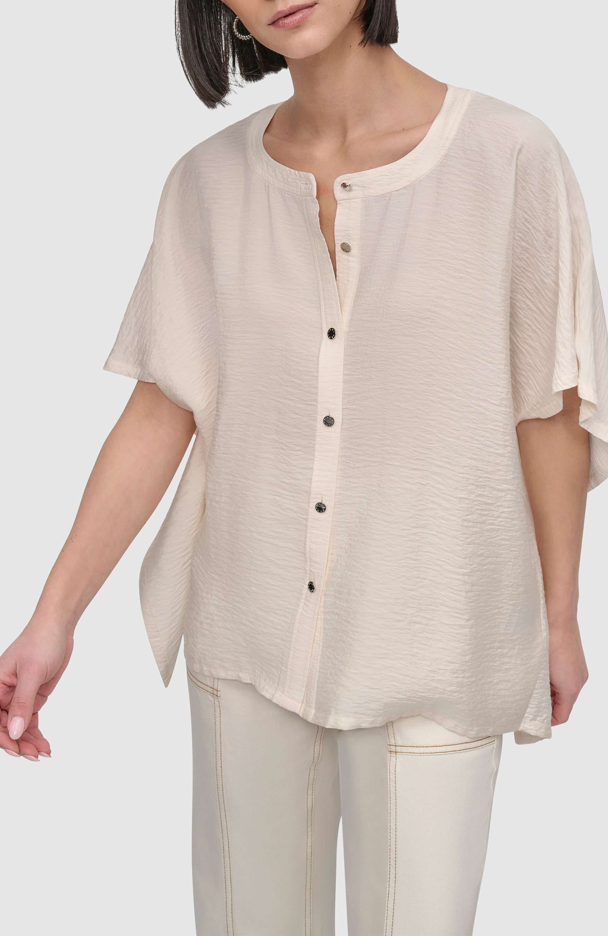 This DKNY Flowy Rumpled Voile top features short sleeves and a mandarin collar, combining comfort with a refined silhouette. The front button closure adds a classic touch, while the lightweight, flowy fabric ensures effortless movement and breathability, perfect for a polished yet relaxed look.