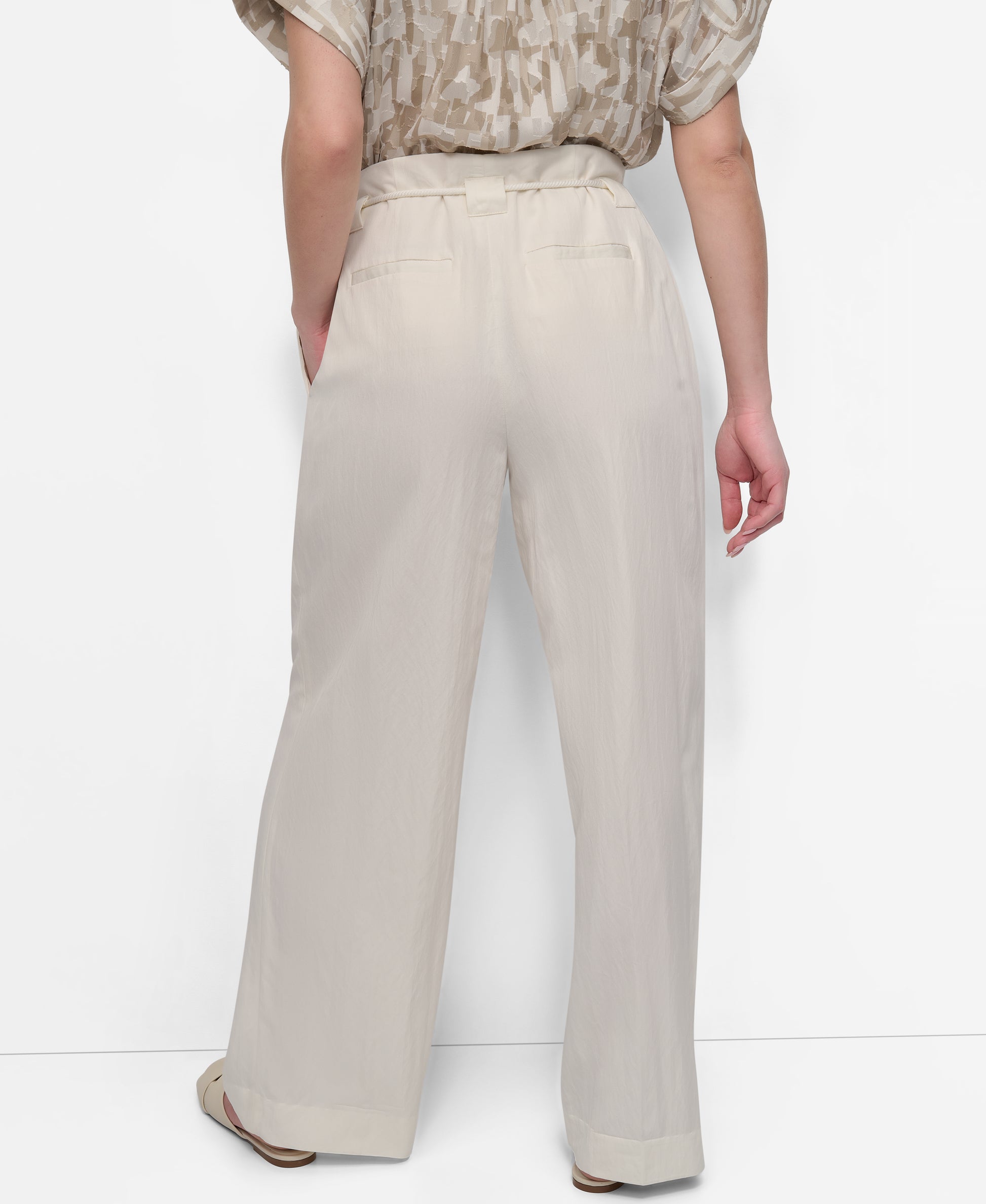 Crafted from a premium blend of 85% rayon and 15% nylon, these DKNY rope tie front wide leg pants offer exceptional comfort and durability. Designed with a flattering wide leg cut and an adjustable rope tie waist, they provide a sophisticated yet relaxed silhouette ideal for both work and casual settings. Elevate your wardrobe with these versatile pants that balance style and functionality expertly.
