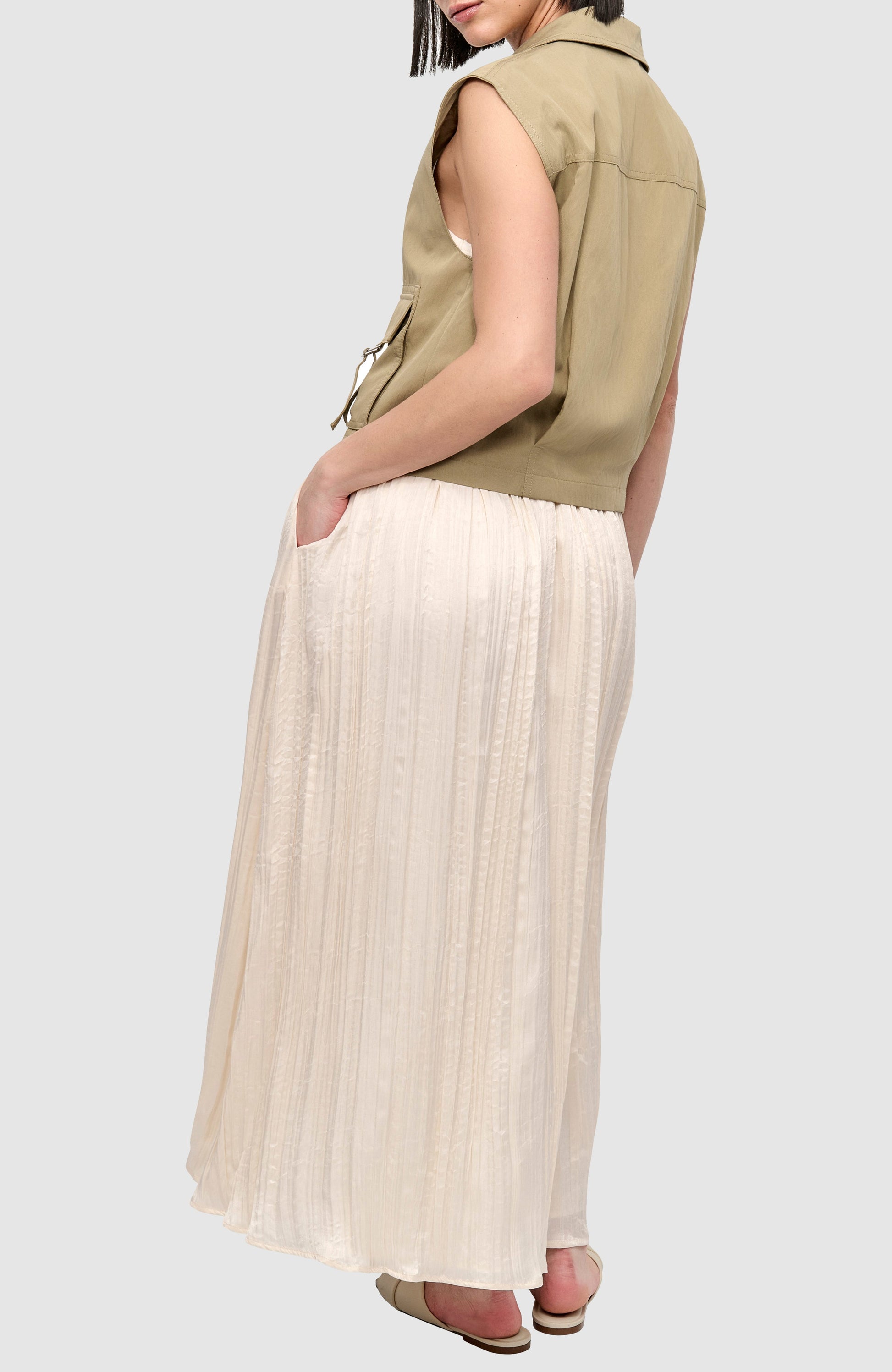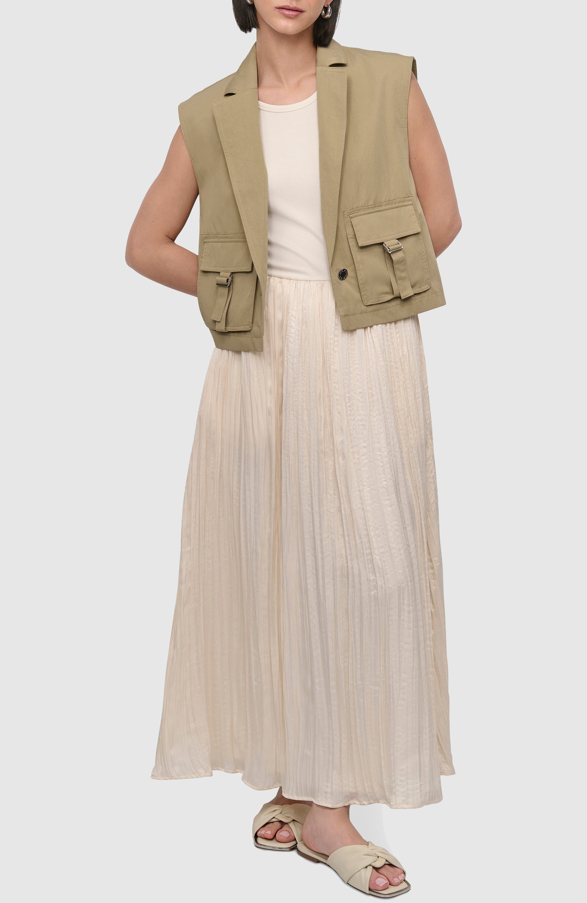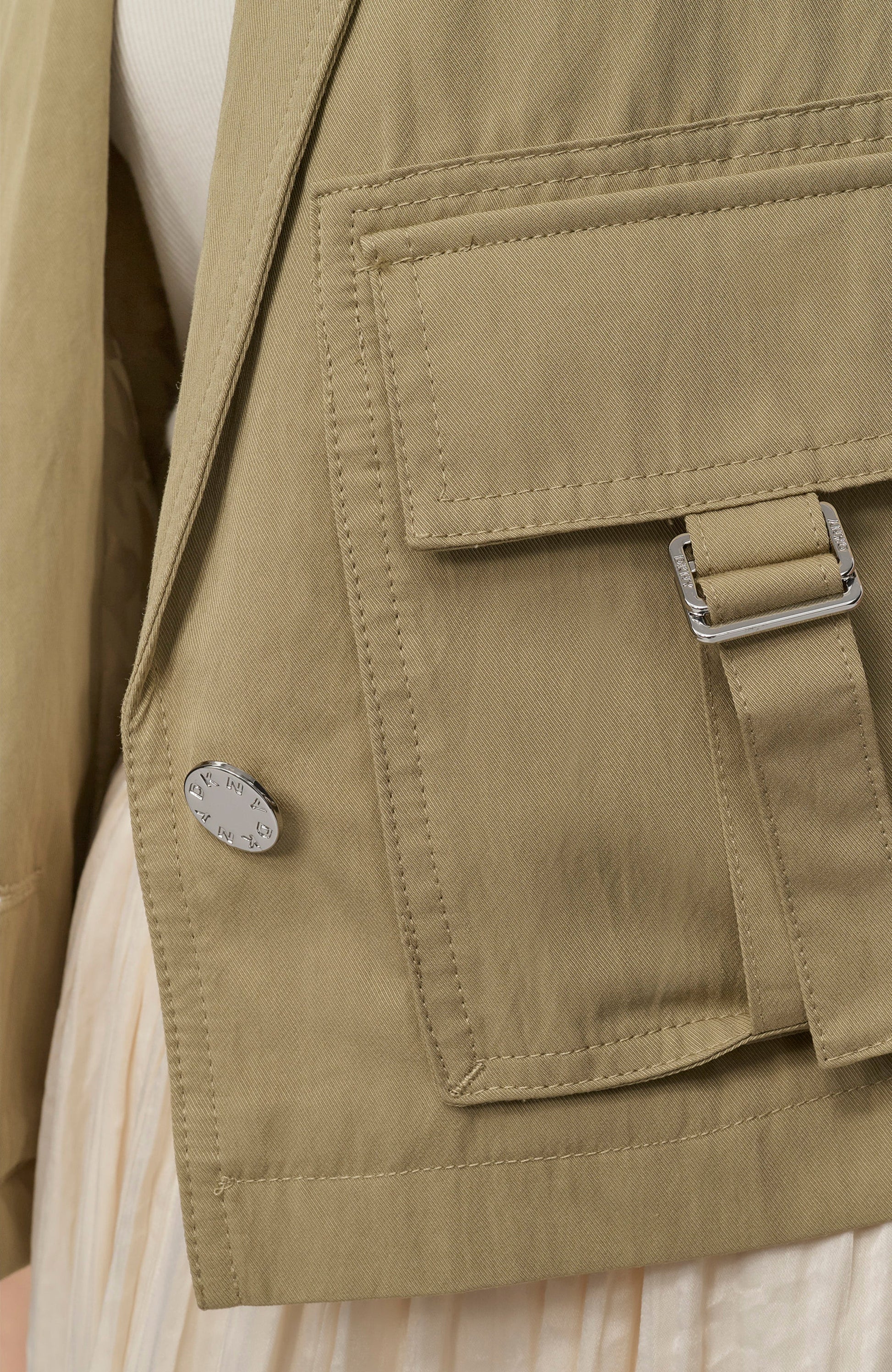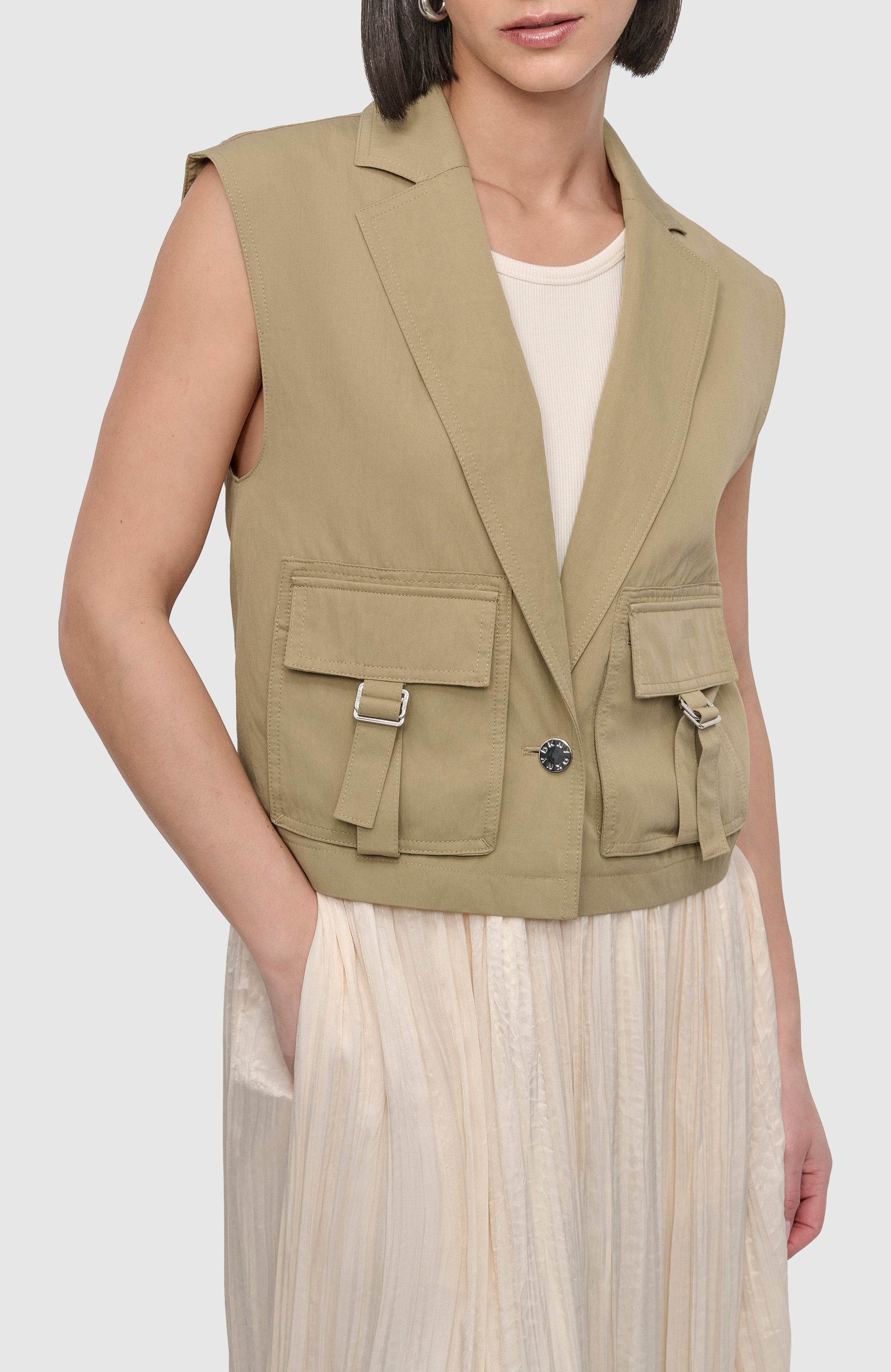 This sleeveless Tumble Twill Tank Cargo vest from DKNY combines functional design with modern style. Crafted from durable twill fabric, it offers a structured yet comfortable fit. Multiple cargo pockets provide practical storage, making it ideal for layering and versatile wear. Perfect for those seeking a sleek, utilitarian look with expert craftsmanship.