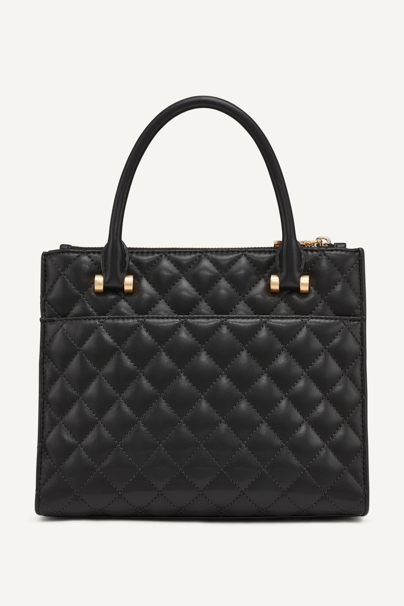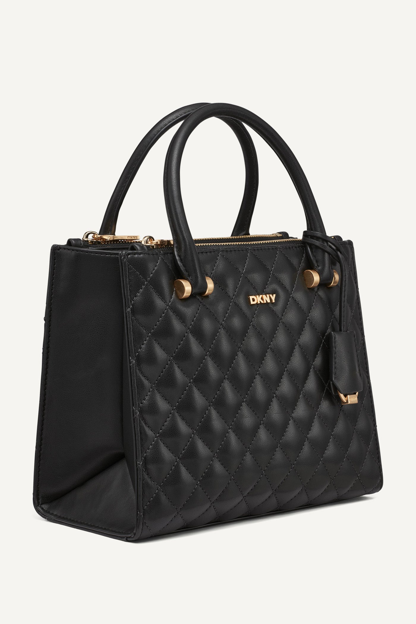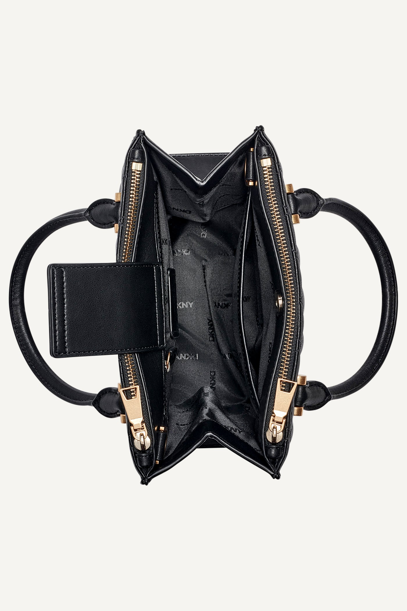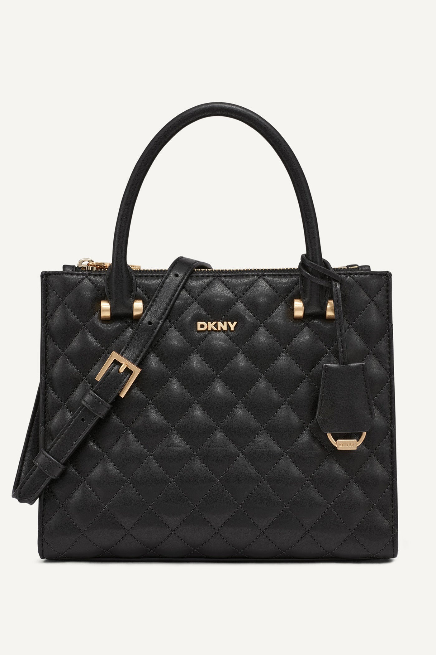 Elevate your everyday style with the DKNY TRINA Medium Satchel in classic black. Featuring structured top handles, luxe hardware, and spacious compartments, this chic bag perfectly marries function and sophistication-ideal for both work meetings and weekend outings.