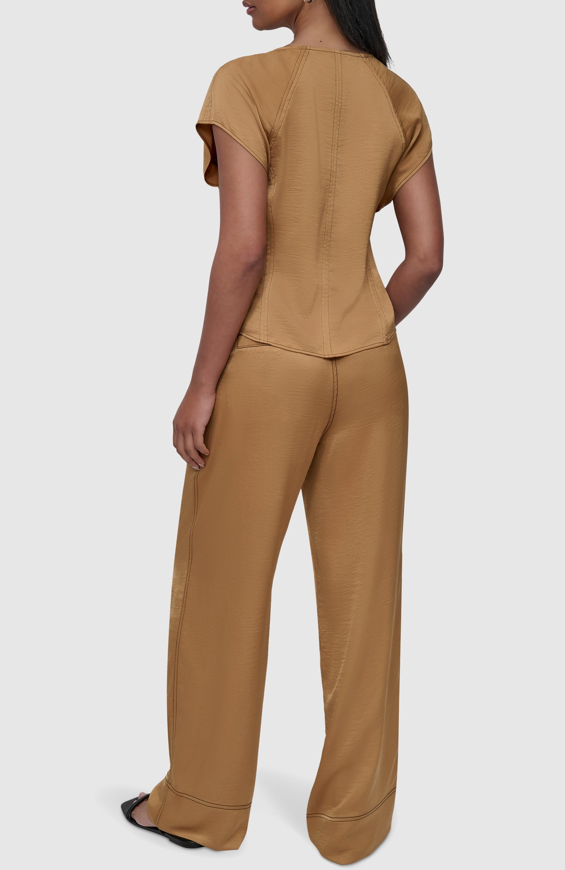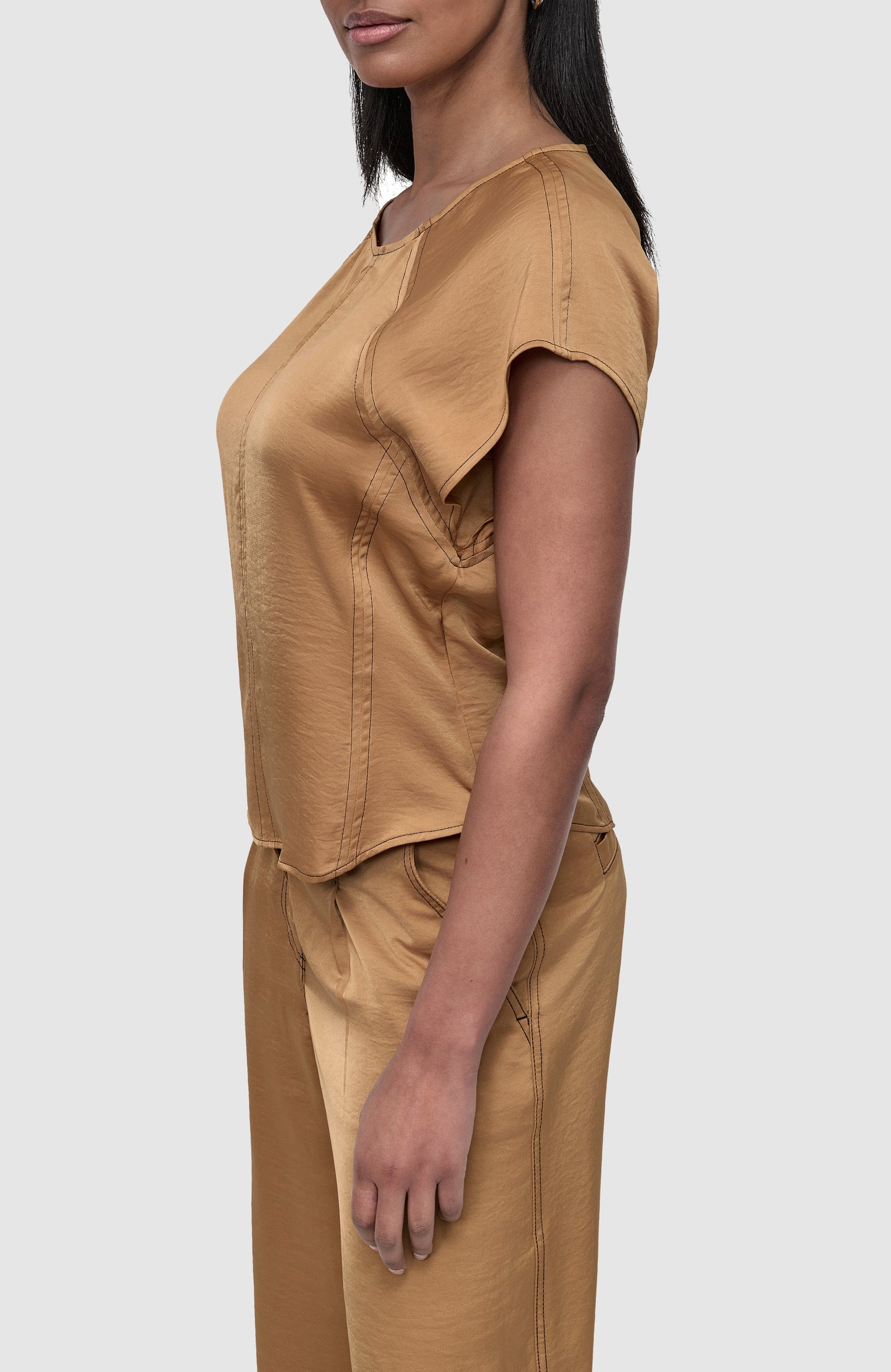 This DKNY sleeveless tank features elegant flutter sleeves that add a soft, flowing silhouette to the design. Crafted with a glazed finish, the fabric offers a subtle sheen, enhancing its sophisticated appeal. Ideal for layering or wearing alone, this top combines modern style with effortless comfort.