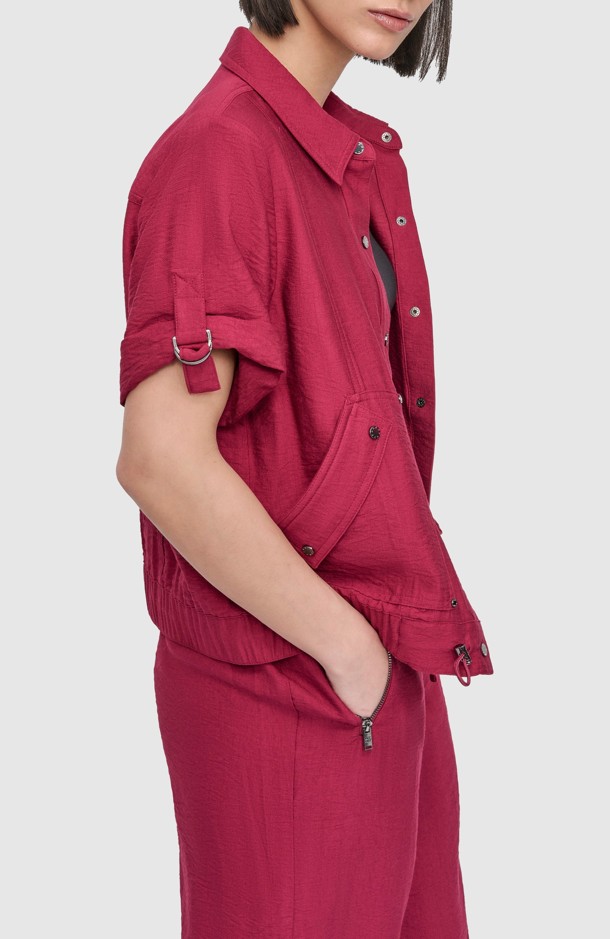 This DKNY Short-Sleeved Overshirt features a pointed collar and short sleeves for a polished yet relaxed look. Designed with a front button closure and practical side pockets, it combines style with functionality. Ideal for layering, this versatile piece offers both comfort and sophistication.