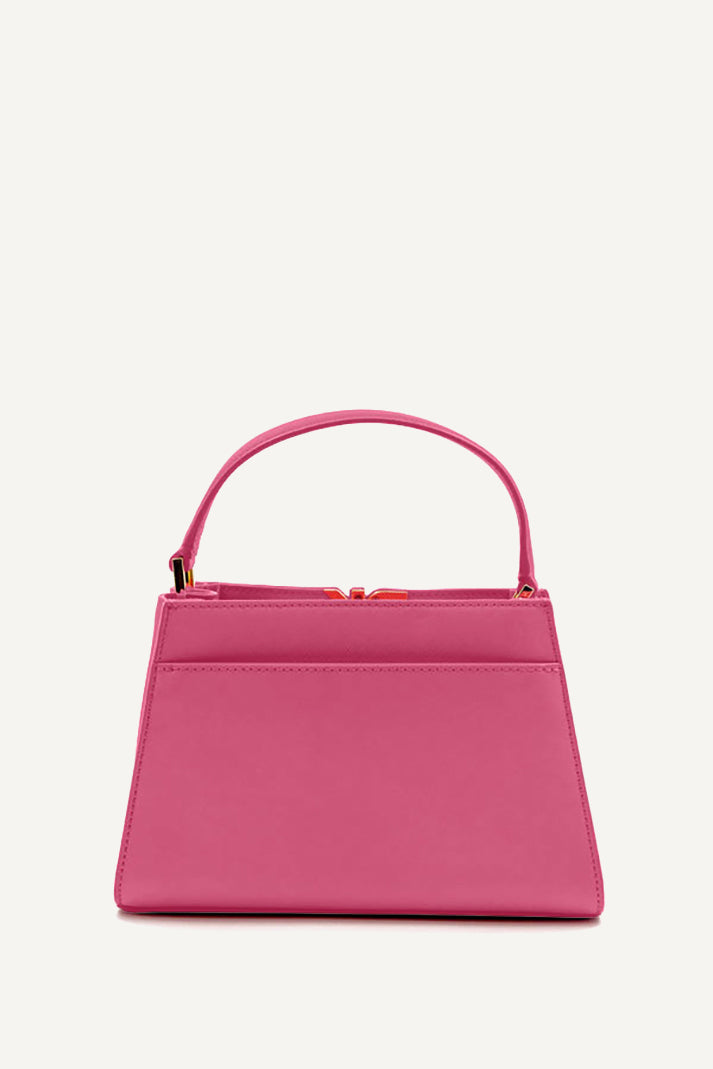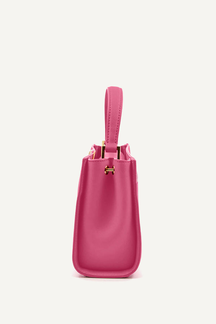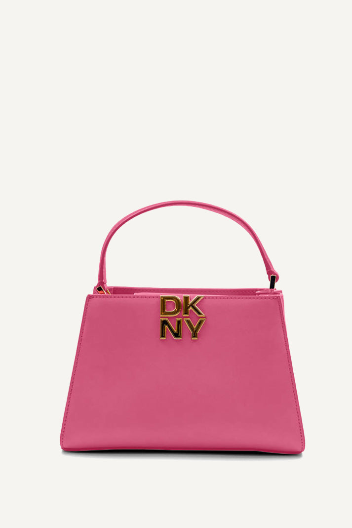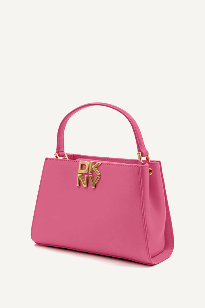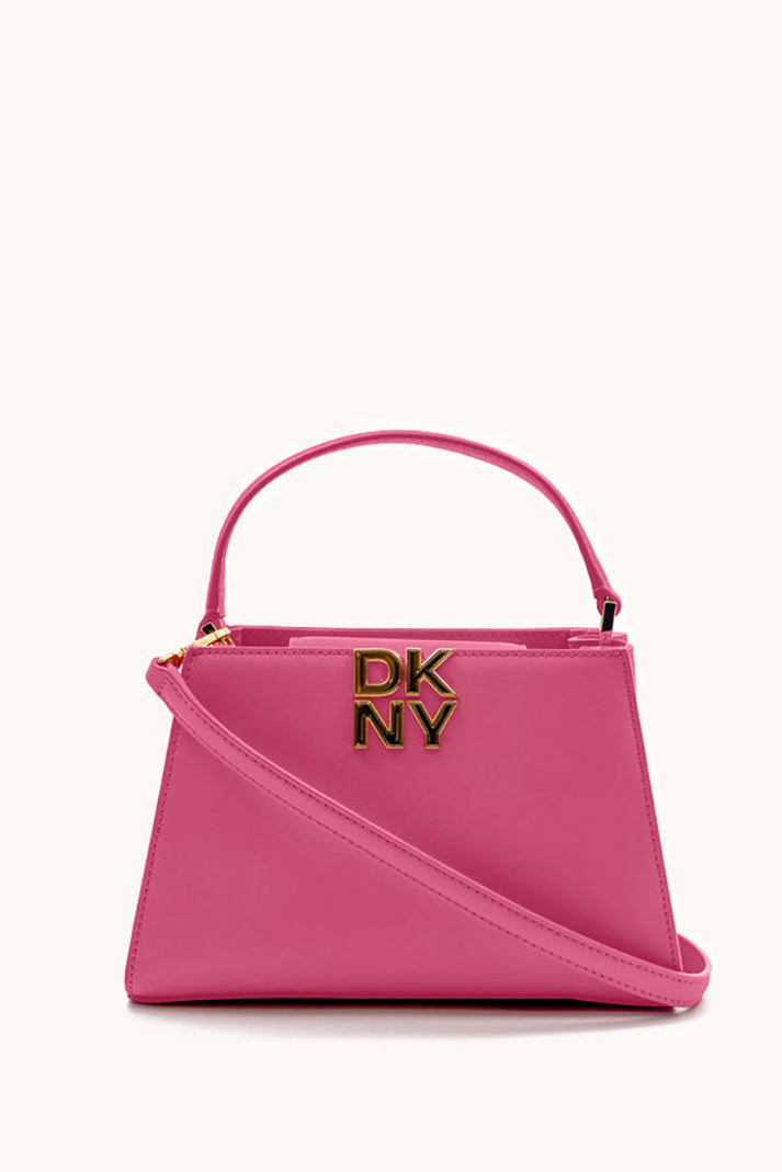 Brighten your look with the DKNY Foster Small Satchel in vibrant pink. This top handle bag boasts a structured silhouette, luxe detailing, and versatile carrying options. Perfectly sized for essentials, it adds a chic pop of color to any outfit.